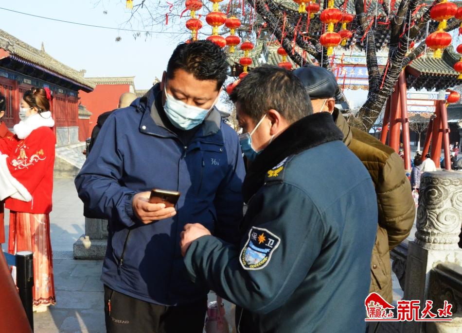 疫情防控不松懈,文明旅游俨然已经成为市民出行的新风尚。“请出示健康码、测量体温,戴好口罩……”在伏羲庙入口处,伴随着喇叭里循环播放的疫情防控提示,佩戴口罩的游客正在有序排队,自觉接受体温检测以及健康码查验、实名登记,排队有序进入景区。