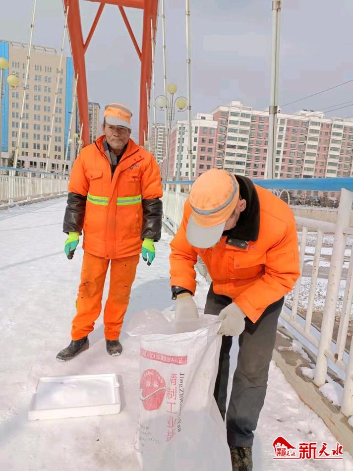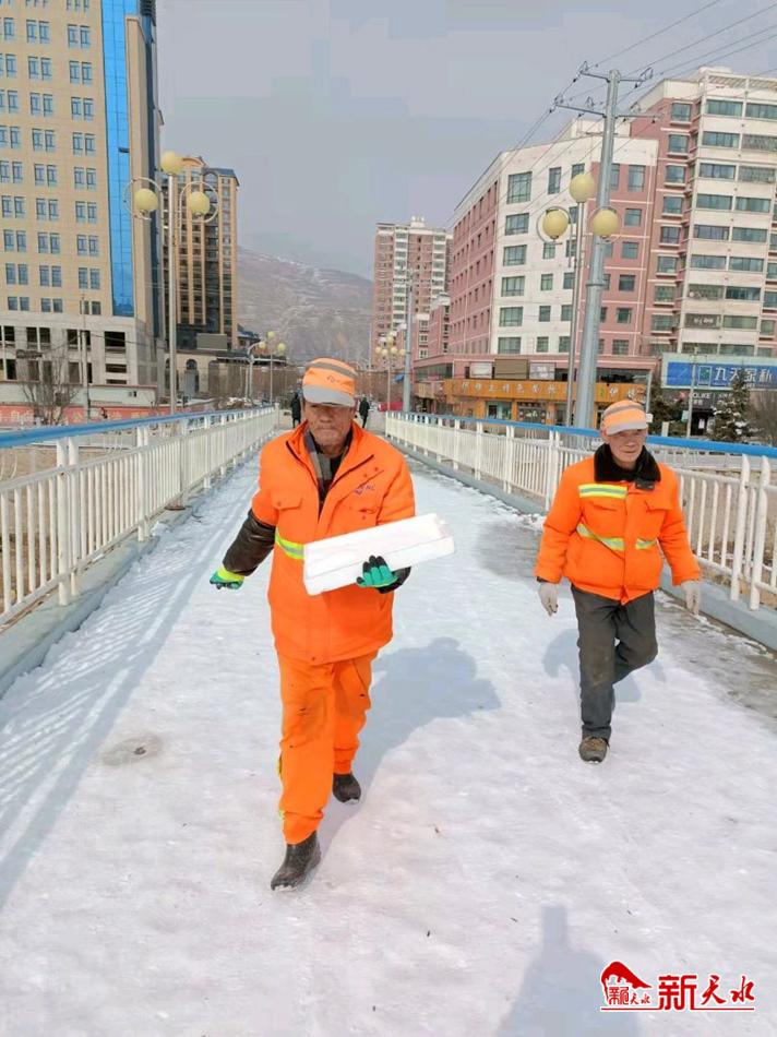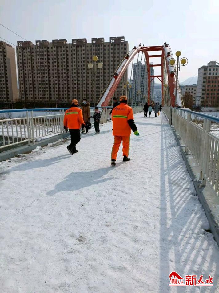 新天水讯【通讯员 王跟萍 李竹青】2月7日,农历正月初七,春节长假上班的第一天。一大早,武山环卫公司100多名环卫分散在县城民主路人行桥、县城二号渭河桥、城东区彩虹桥、西关大桥上、南北滨河路人行道及健身步道上采取铲除、撒盐的方式,清雪除冰,为市民及上班人群创造安全方便的出行环境。