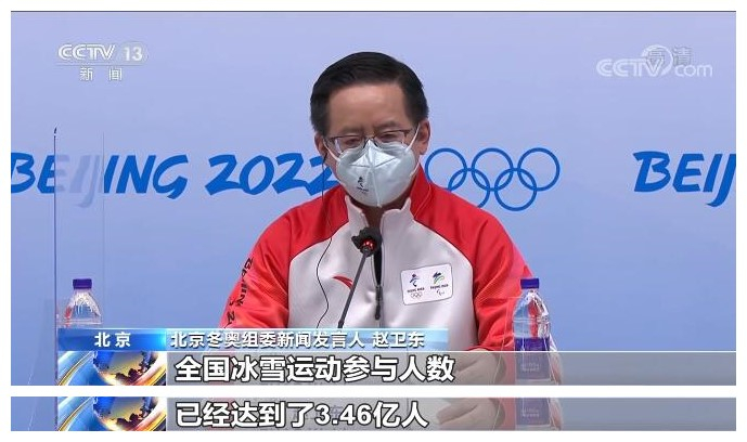 北京冬奥组委新闻发言人 赵卫东:谢谢你的提问,这个问题提得很好。冰雪运动在中国自从申办冬奥成功之后,它的普及得到了加速。我们大力推广冰雪运动,现在中国从北到南总共有654块标准的冰场和803块滑雪场,这个数字它比2015年申办冬奥的时候增加了317%和41%。统计数据显示,全国冰雪运动参与人数已经达到了3.46亿人。