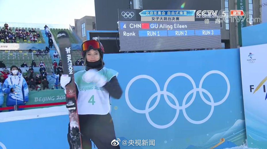 谷爱凌正式出战自由式滑雪女子大跳台决赛。这是她在北京冬奥第一个决赛!她的第一跳得分93.75!全场最高!