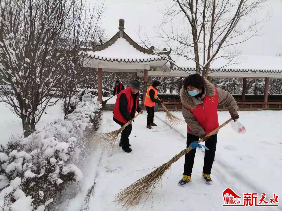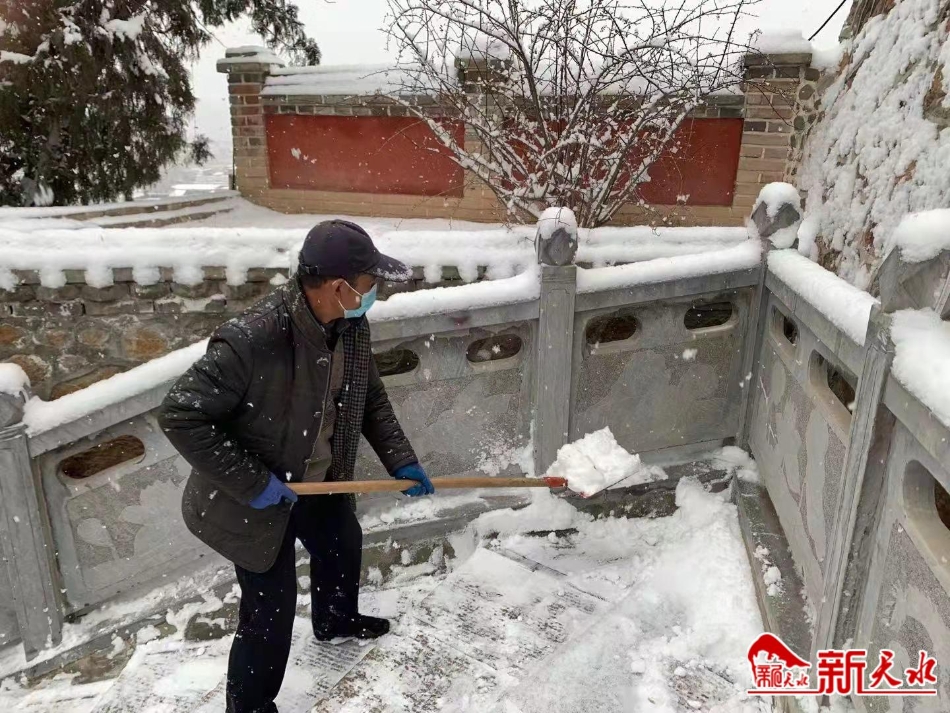 2月6日,秦安凤山景区管理所职工正在清扫景区内的积雪。连日来秦安普降大雪,为确保群众在春节假期游园安全,景区组织职工及时在游客中心、景观道路、庙前广场等范围内开展清扫积雪、铲除冰冻活动。
