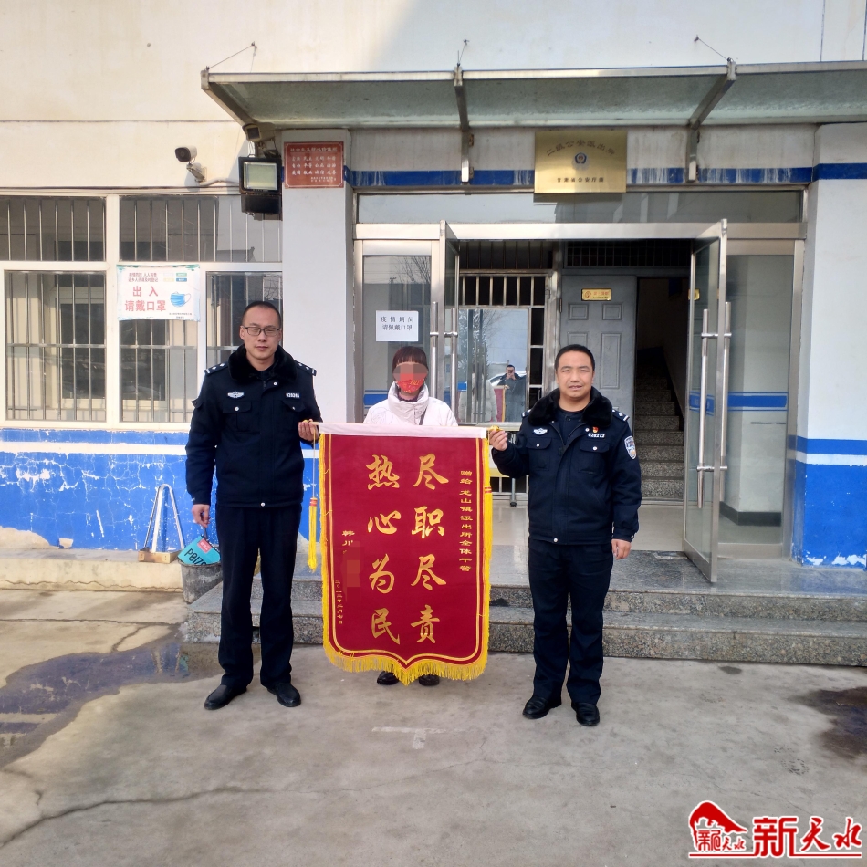 新天水讯【记者蔚军平】2月7日,张家川回族自治县龙山镇某村的窦女士来到龙山派出所,将一面写有“尽职尽责、热心为民”的锦旗递到派出所民警手中,对帮助她找回手机的民辅警表示感谢。