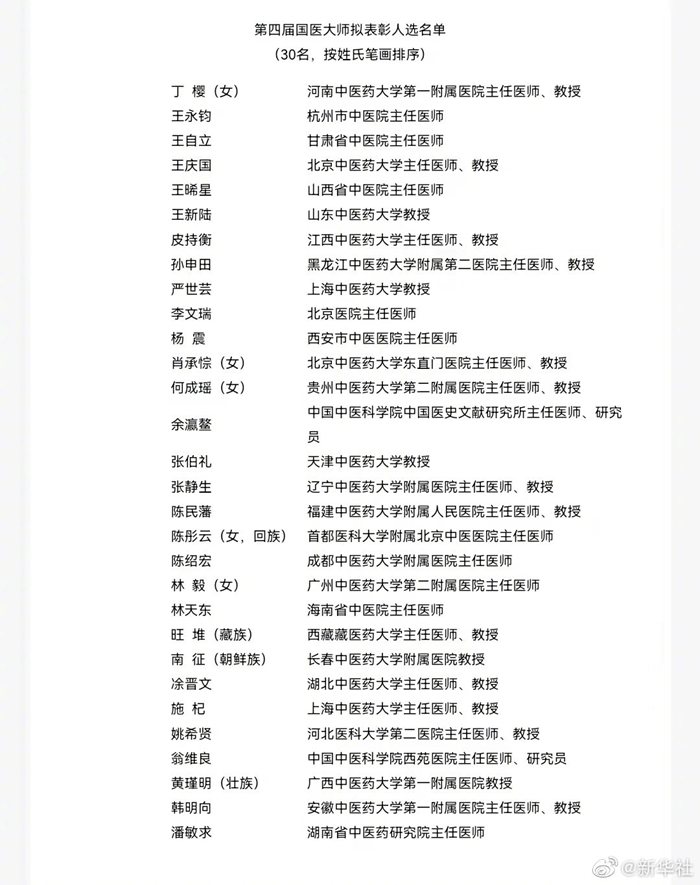 记者8日从国家中医药管理局获悉,经逐级推荐和评审,并经第四届国医大师评选表彰工作领导小组审核,拟授予30人国医大师称号,现予以公示,公示期为2022年2月8日至2022年2月14日。天津中医药大学教授张伯礼等入选该名单。(记者田晓航、宋晨)