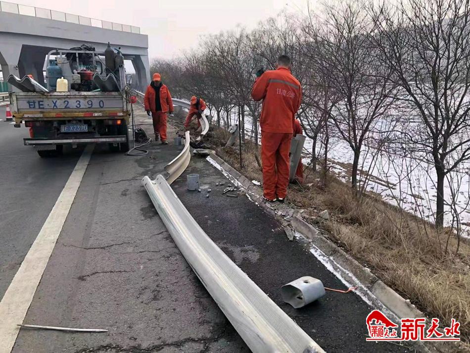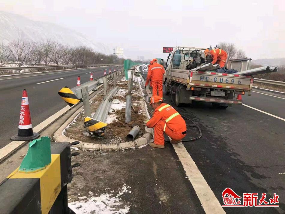 降雪停止后,天水公路事业发展中心高速公路养护所抓住晴好天气,立即组织交通设施专业化维修队三个作业组,投入施工车辆3辆,养护职工15人,及时修复损坏交通安全设施,消除安全隐患。修复后使用等级不低于原路线标准并保持线性顺畅、外表美观,保障道路安全畅通,为车辆行人提供良好高速公路春运出行环境。