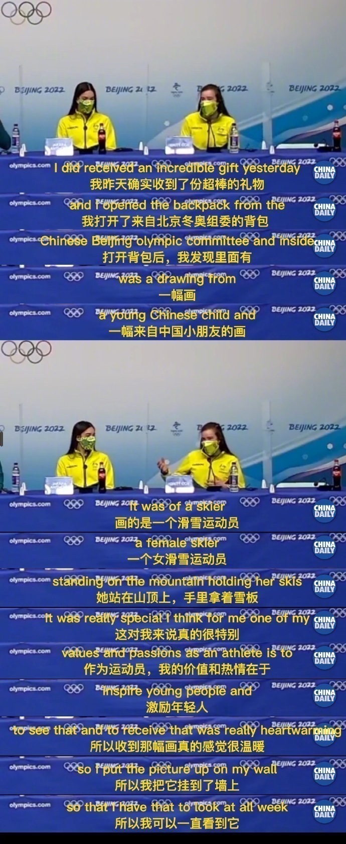 近日,多位居住在冬奥村的运动员在社交媒体上晒出了自己收到的运动员背包,背包中一份“特殊”的新年礼物格外引人关注。这是从全国各地青少年提交的超过43000幅绘画作品中选出的7500幅作品,作为一份特殊的新年祝福赠送给前来参赛的各国家(地区)代表团成员。