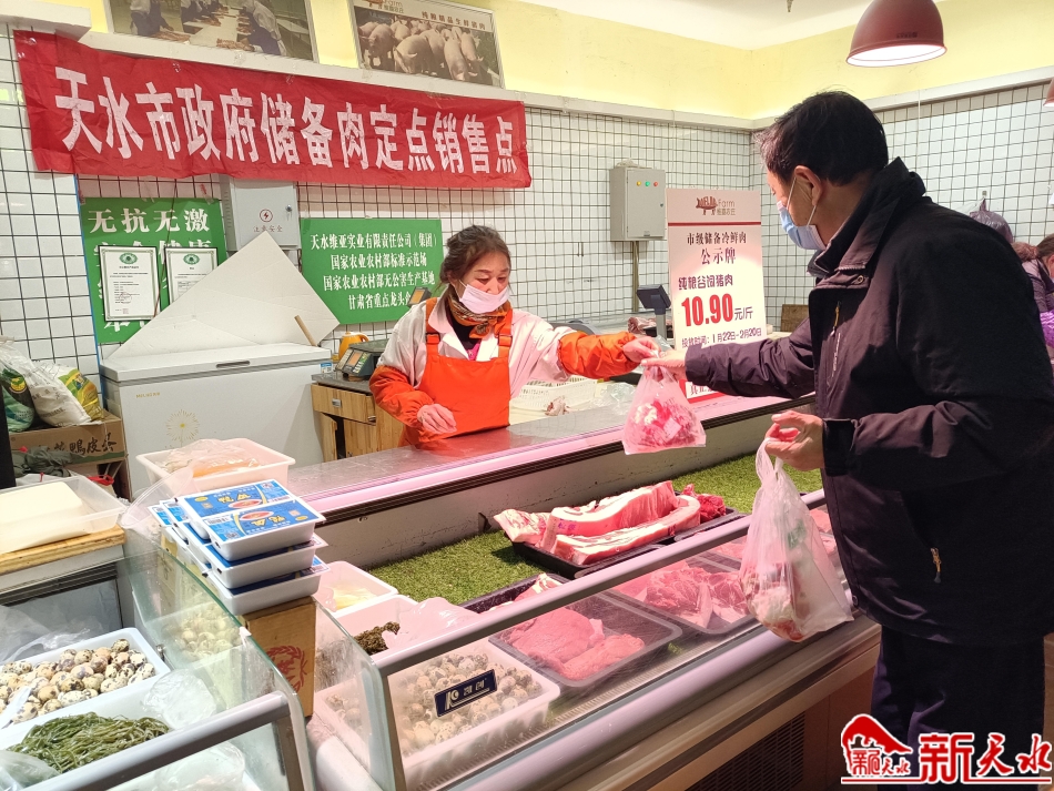 “储备肉很新鲜,价格也合适,我家离超市近,已经买了好几次了。”2月8日,记者在秦州区七里墩兰天超市天河店时,一位在挂有“天水市政府储备肉定点销售点”横幅的柜台前购买储备肉的市民对记者说。记者看到,这个柜台前不仅悬挂了横幅,还设置了市级储备冷鲜肉的公示牌,用红色字体标注的“10.9元/斤”的内容十分醒目。