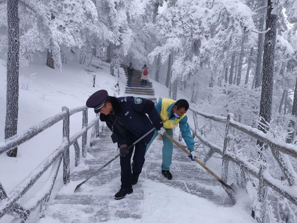 为确保游客安全出行,他们每天还有参与片区的铲冰除雪工作,这可是项体力活。每天清晨,赶在游客上山之前,铲雪工作得抓紧进行。“冷是真冷,真活动起来反而暖和了。”汪新平边说,边对着冻得通红的双手哈气。