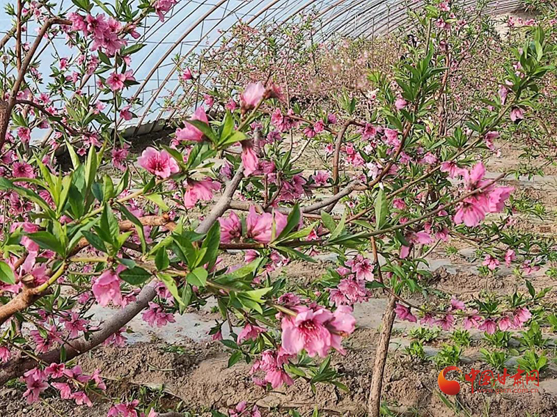 气温渐暖,大地回春。瓜州县西湖镇中沟村生态果蔬采摘园温室大棚里的桃花竞相绽放、娇艳动人,散发出春天的气息,孕育着丰收的新希望。