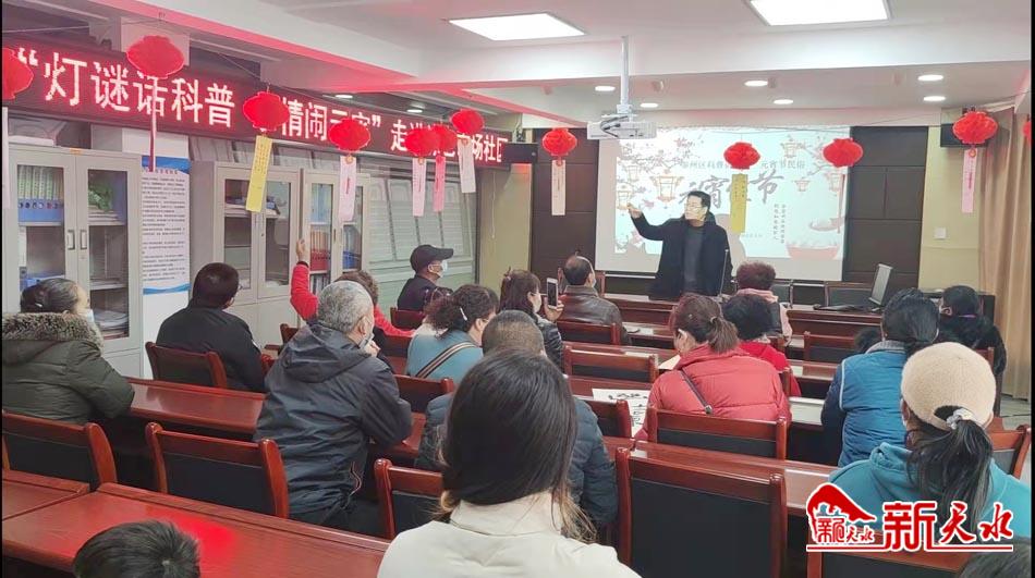 元宵节来临之际,为弘扬中华民族传统节日文化,为居民提供相互沟通机会,拉近居民之间的距离,营造良好的社区氛围和邻里关系,秦州区科普队联合中城街道举办这场庆元宵猜谜语和元宵节民俗文化讲座活动,让社区党员、居民和志愿者共同感受节日氛围,引导大家感受传统文化魅力,认知传统、尊重传统、继承传统、弘扬传统,提升居民文明素质和社会文明程度。甘肃省作家协会会员、秦州文化科普大使阎虎林从元宵节的名称入题,通过对元宵节的来历以及元宵节在隋、唐、宋、明、清各个历史时期的演变发展等进行详细讲解,深刻阐释了元宵节的深厚文化内涵。