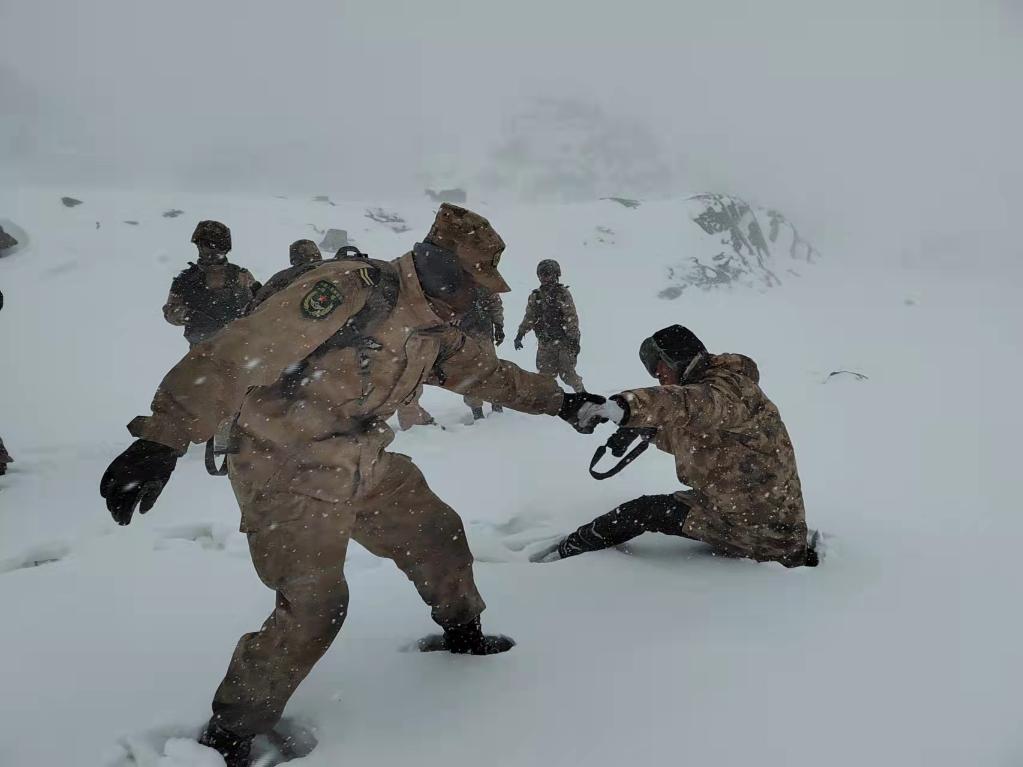 中央广播电视总台军事部记者刘笑宇(右一)和西藏军区标沙拉错哨点的官兵一同在海拔近5000米的边防线巡逻。