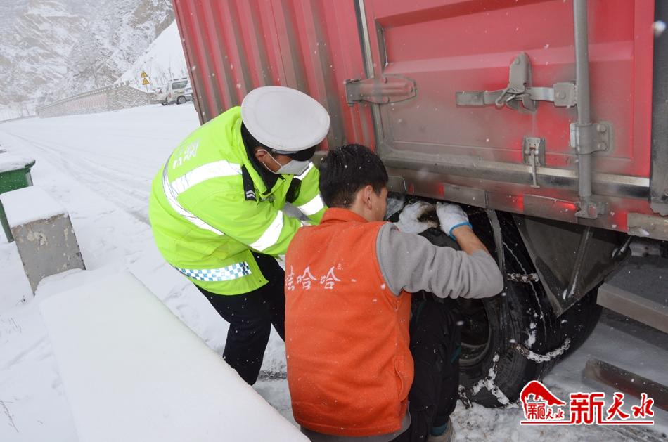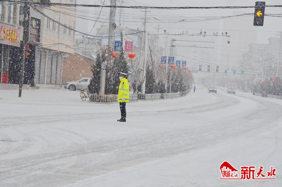 新天水讯【记者余碧波】受强冷空气的影响,2月18日,张家川回族自治县迎来降雪天气,路面积雪结冰,存在道路安全隐患。雪情就是警情,面对恶劣天气给道路交通安全造成的影响,张家川公安交警迅速启动恶劣天气应急管理预案,快速反应,周密部署,认真落实各项应对措施,全力维护道路交通通行秩序,预防道路交通事故发生,确保风雪恶劣天气条件下道路安全畅通,为群众安全出行创造平安畅通的道路交通环境。