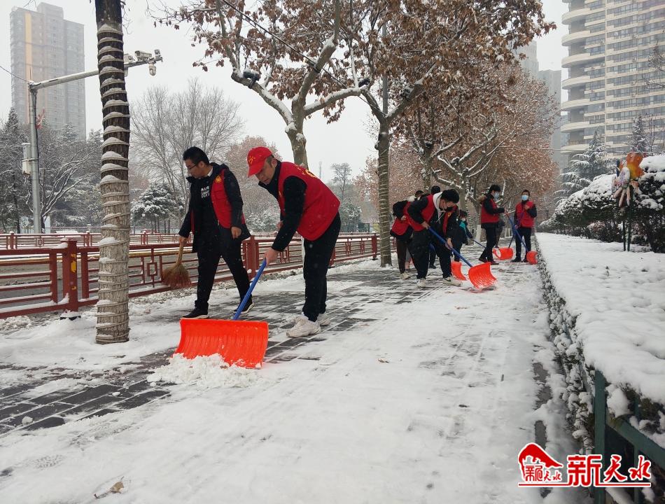 “早上一上班,我们机关志愿群里就发出清扫积雪的倡议,大家积极响应,20多名志愿者经过1小时的忙乎,公园路两边人行道上的积雪都已经清扫完,现在正在清扫樱花园甬道上的积雪。”市政协机关志愿服务队一位姓任的志愿者说。