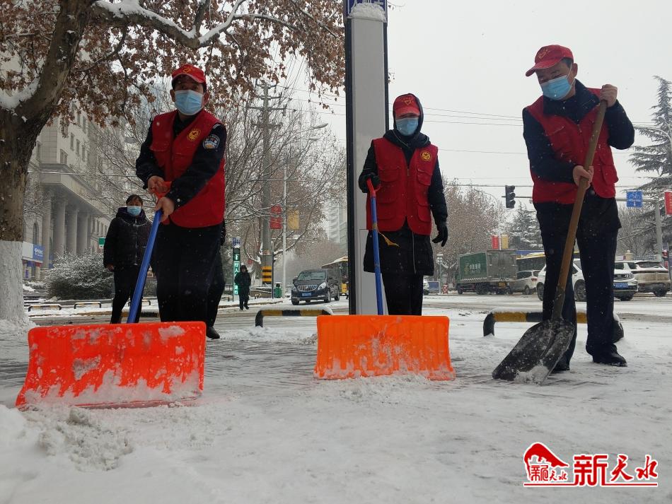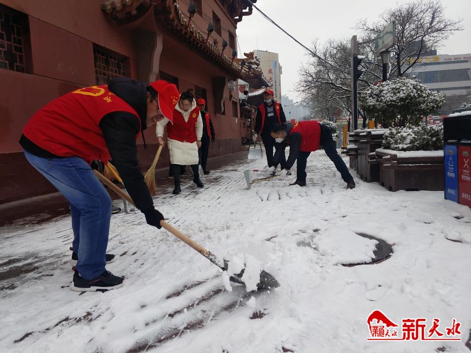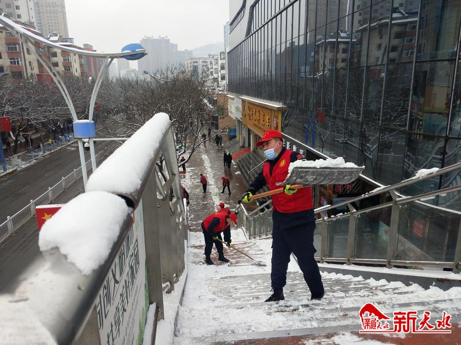 在龙城广场过街天桥及南边东西的人行道上,市公安局特警支队的小伙子干劲十足,有的在路上清扫,有的在桥上铲除,市委机关工委的志愿者在文庙附近忙碌着。在秦州的大街小巷里,一片片红色在白与灰之间移动,他们面前是湿滑危险的冰雪,他们身后是干净安全的通道,雪后的街头,志愿服务队的红马甲和小红帽显得格外靓丽耀眼。