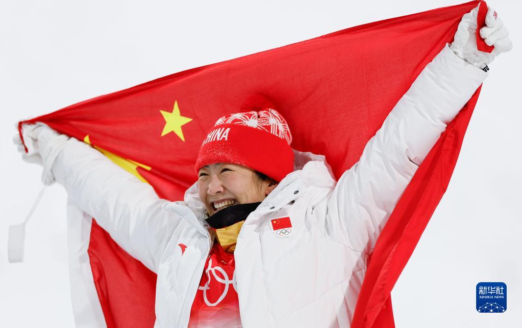 2月14日,中国队选手徐梦桃庆祝夺得自由式滑雪女子空中技巧冠军。新华社记者费茂华摄