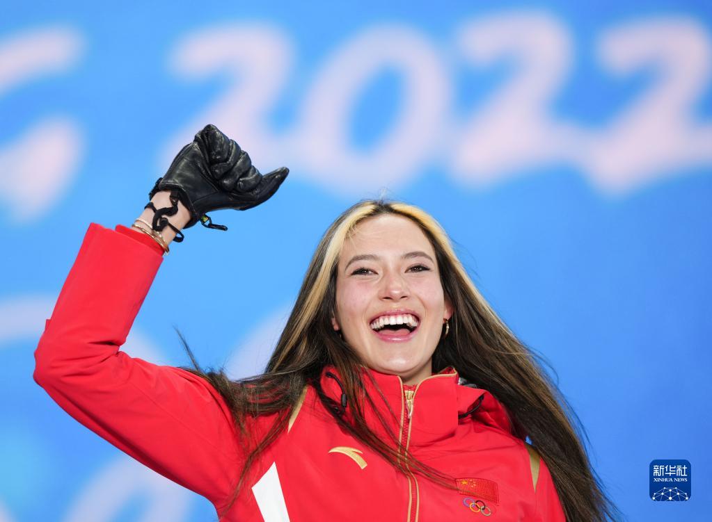 2月18日,冠军中国队选手谷爱凌在自由式滑雪女子U型场地技巧奖牌颁发仪式上。新华社记者薛玉斌摄