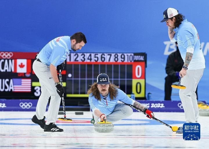 2月18日,美国队选手马特·汉密尔顿(中)在冰壶男子铜牌赛比赛中掷壶。新华社记者王婧嫱摄