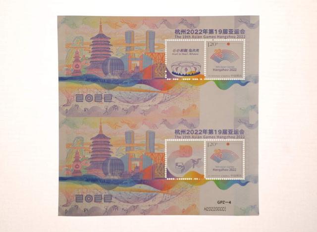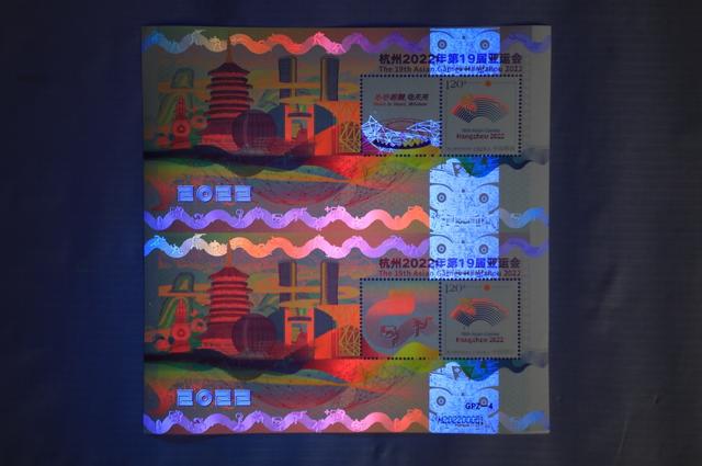 据了解,《杭州2022年第19届亚运会》特殊版式个性化邮票双连张是中国集邮有限公司匠心打造的首款GPZ编号体育题材邮票,由青年设计师赵郁竹担纲设计,限量发行。它依托杭州亚运会色彩系统和视觉形象元素,融历史文化、现代美学和未来畅想于一体,集艺术感、科技感和运动感于一身,展现中华文明、浙江风采、杭州韵味和时代魅力,采用特殊版式、编号和工艺,紫光灯下局部呈现无色荧光油墨图案和全真彩效果,传递中国邮政对杭州亚运的美好祝福。