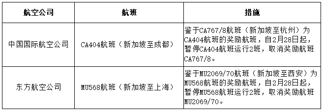 根据民航局通报,2月9日入境的中国国际航空公司CA404航班(新加坡至成都)确诊新冠肺炎旅客5例,鉴于CA767/8航班(新加坡至杭州)为CA404航班的奖励航班,自2月28日起,暂停CA404航班运行2班,取消奖励航班CA767/8。2月10日入境的东方航空公司MU568航班(新加坡至上海)确诊新冠肺炎旅客5例,鉴于MU2069/70航班(新加坡至西安)为MU568航班的奖励航班,自2月28日起,暂停MU568航班运行2班,取消奖励航班MU2069/70。上述熔断的航班量不得用于其它航线。