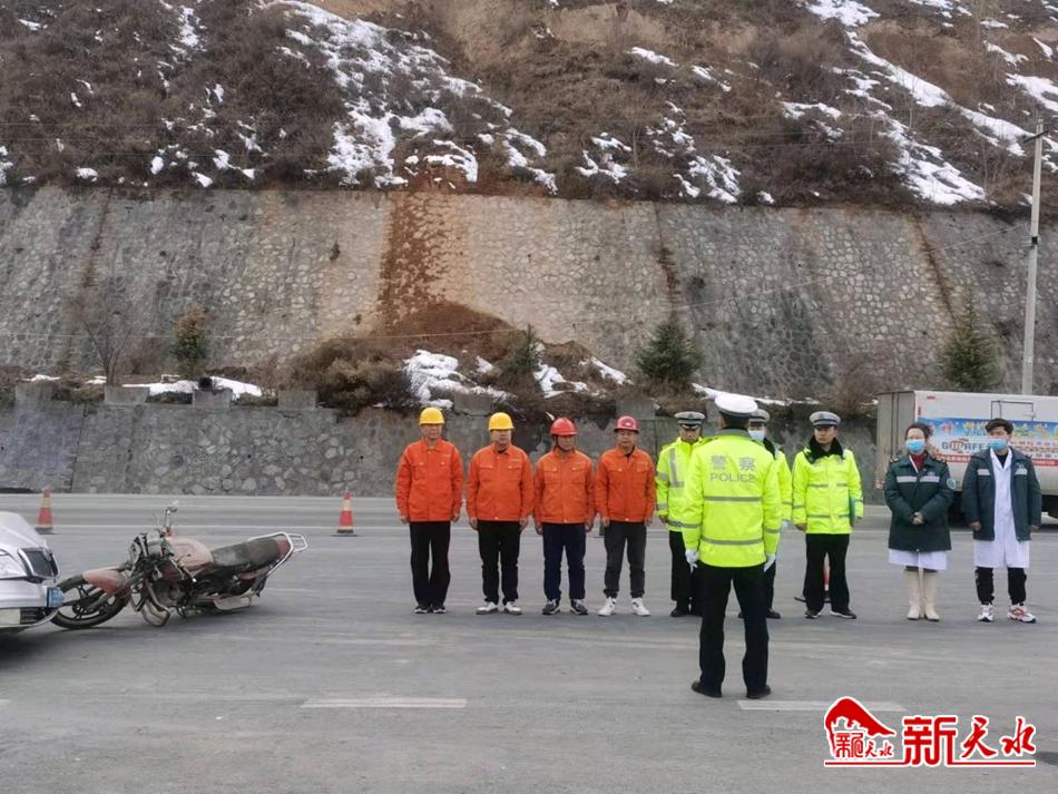 新天水讯【特约通讯员 胡泽庭】2月23日,天水公路事业发展中心高速公路养护所卦台山隧道管理站、天水市公安局交警支队卦台山大队、麦积区三阳医院在国道247线卦台山隧道秦安侧,联合开展模拟恶劣天气下一辆摩托车和一辆小轿车相撞致人受伤交通事故现场应急救援演练。