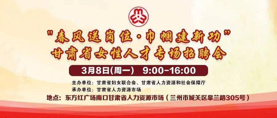 记者从兰州市妇联获悉,“春风送岗位·巾帼建新功”甘肃省女性人才专场招聘会,将于3月8日在广场南口皋兰路305号省人力资源市场举办。