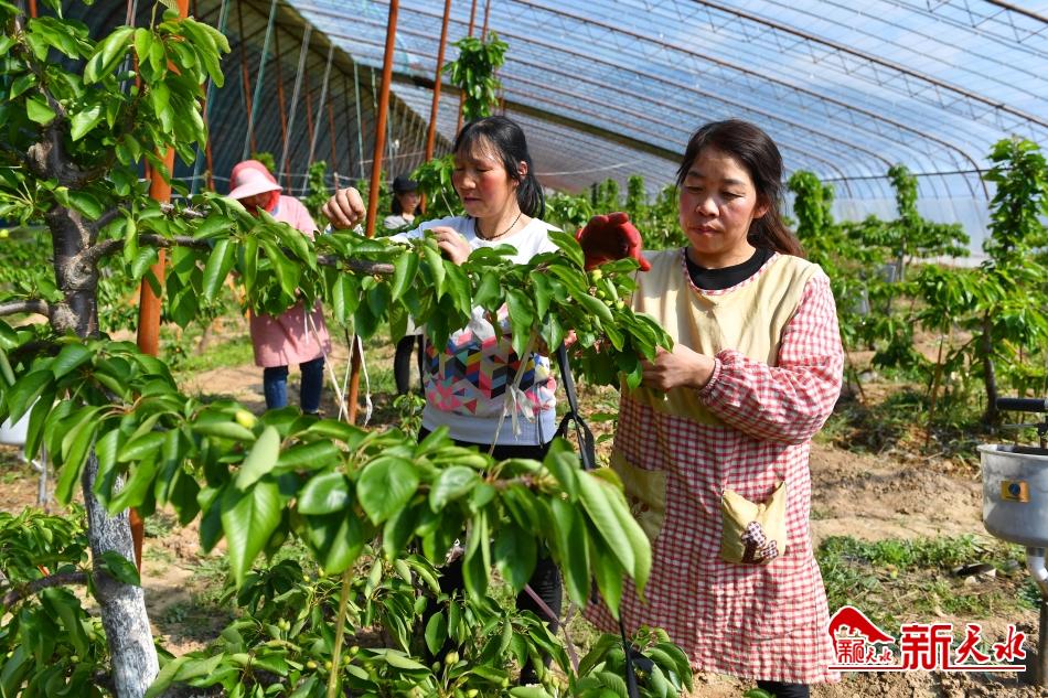 2月28日,在甘谷县安远镇巩川村的设施樱桃大棚里,几名女工正在为樱桃树施肥。温润的大棚里,樱桃树翠绿的树叶间,藏着颗颗大樱桃,有的青绿,有的已经开始发红。据甘谷县佳农果蔬专业合作社的负责人介绍,预计3月10日左右,今年的首批大樱桃将“抢鲜”上市。