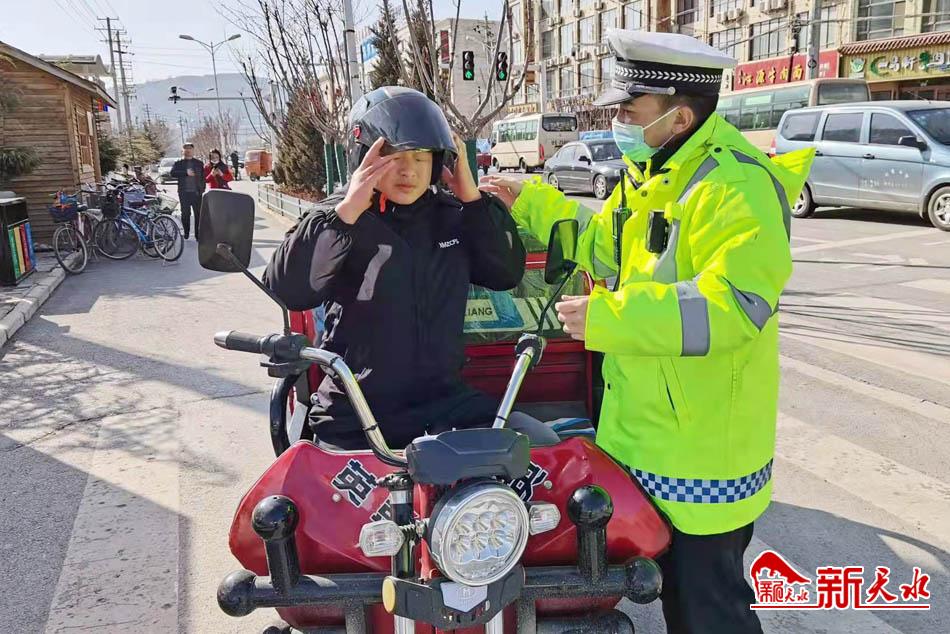 “你好,你骑摩托车怎么不戴头盔呢?”“实在不好意思,想着出门买个东西,走得急忘戴了。”“安全头盔是保护摩托车驾驶人头部的重要护具,不管多急,驾驶人员都要戴……”3月2日,在张家川回族自治县各街道,每当看到骑摩托车不戴头盔的现象,交警就及时进行劝阻。
