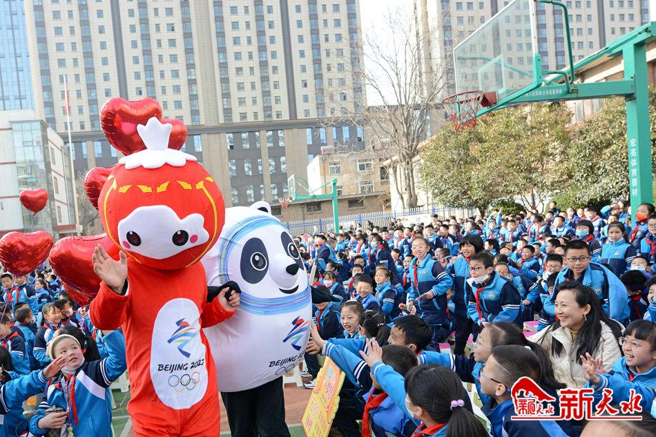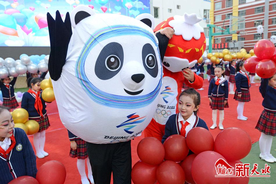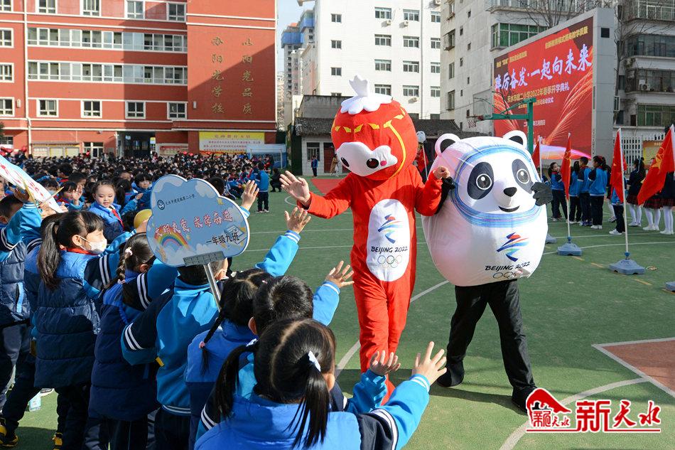 新天水讯【记者孙镇】3月4日,在天水市建设路第二小学的春季学期开学典礼上,由老师装扮的北京2022年冬奥会吉祥物“冰墩墩”和北京2022年冬残奥会吉祥物“雪容融”来到学生们中间,吉祥物可爱的形象引得孩子们与之拥抱、握手。学校通过这种寓教于乐的形式向学生们普及冬奥会知识,激发学生们对冰雪运动的热爱。