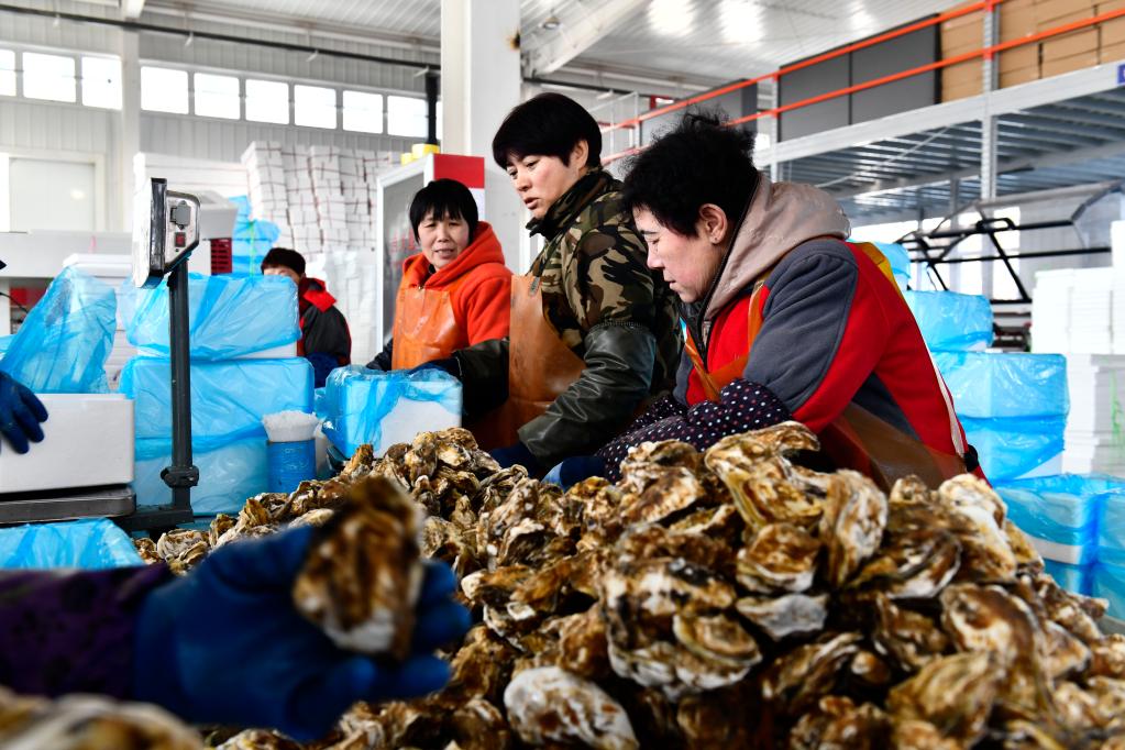 3月4日,在乳山市海阳所镇,工作人员将牡蛎装箱。(新华社记者郭绪雷摄)