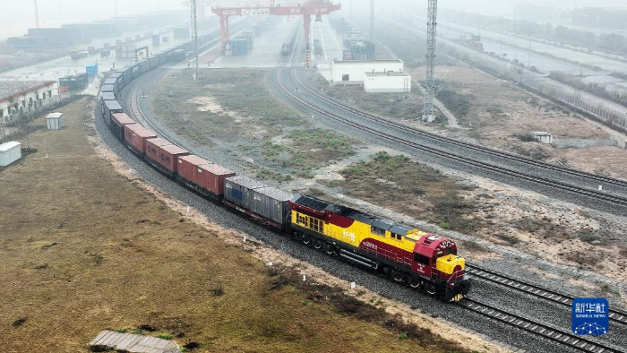 2022年1月15日,广西新年首趟西部陆海新通道年货班列从钦州港东站驶出(无人机照片)。新华社记者 张爱林 摄