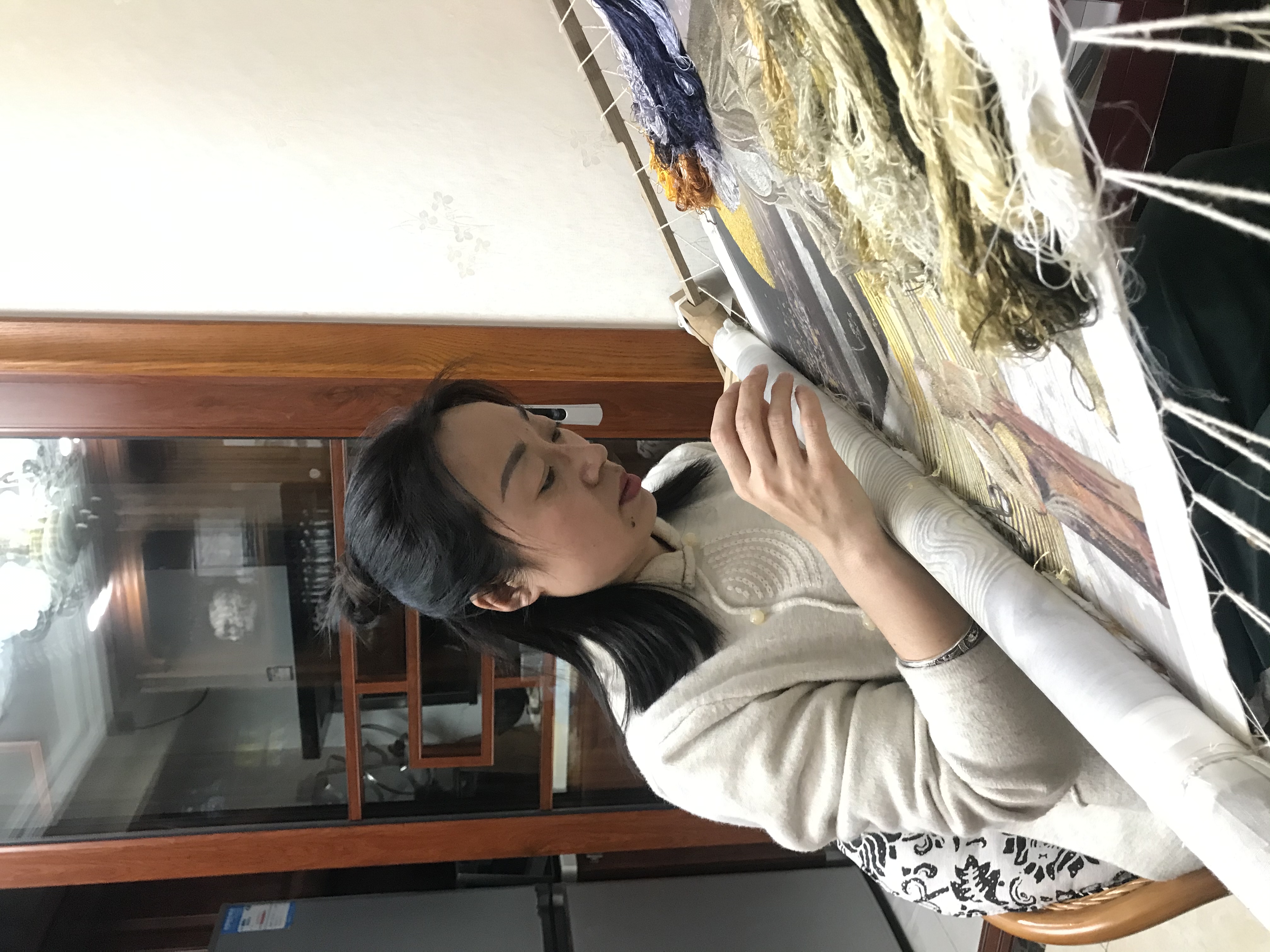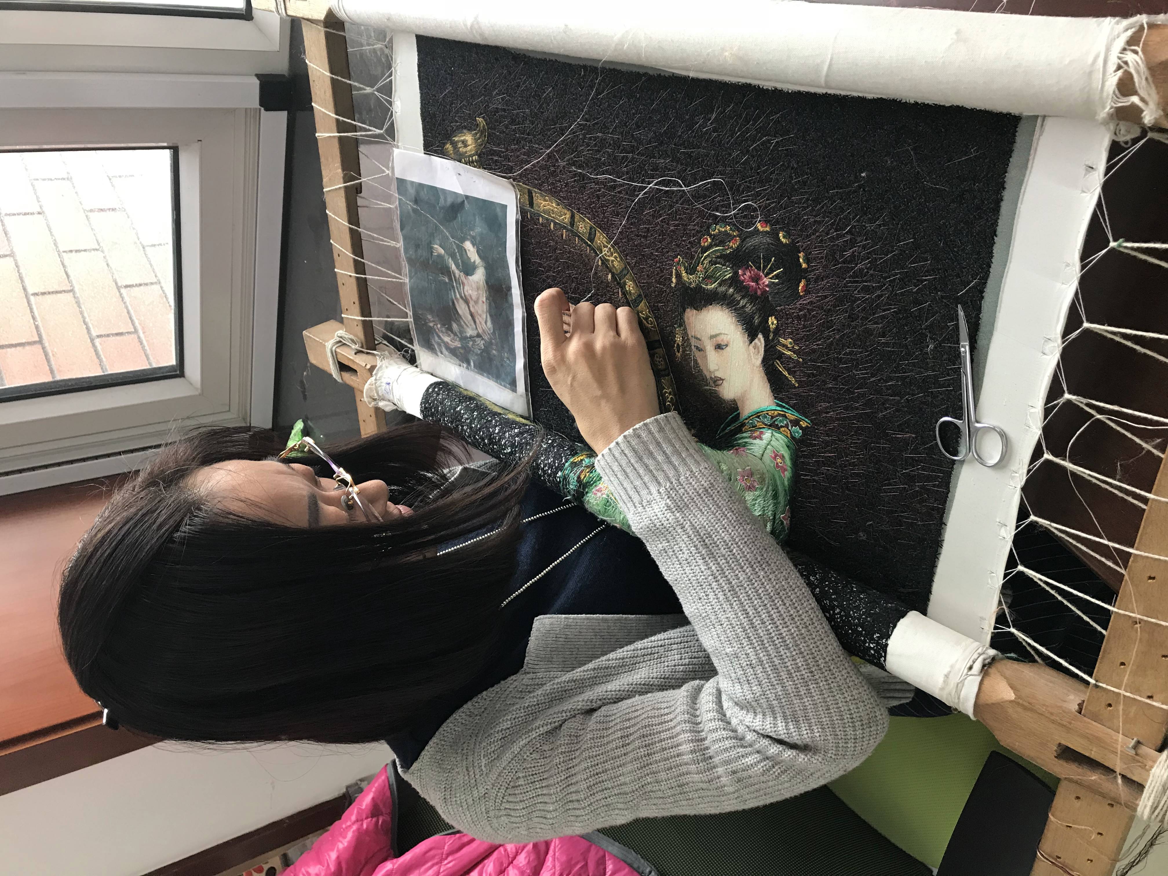 见到曹苑春时,春日午后的斜阳正洒在她的身上,这让盘着长发,伏身绣架前的她愈显温婉柔美。眼前这美好的画面,竟让记者的大脑中蹦出时光安稳、岁月静好的词语来。