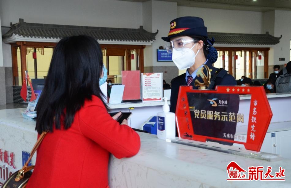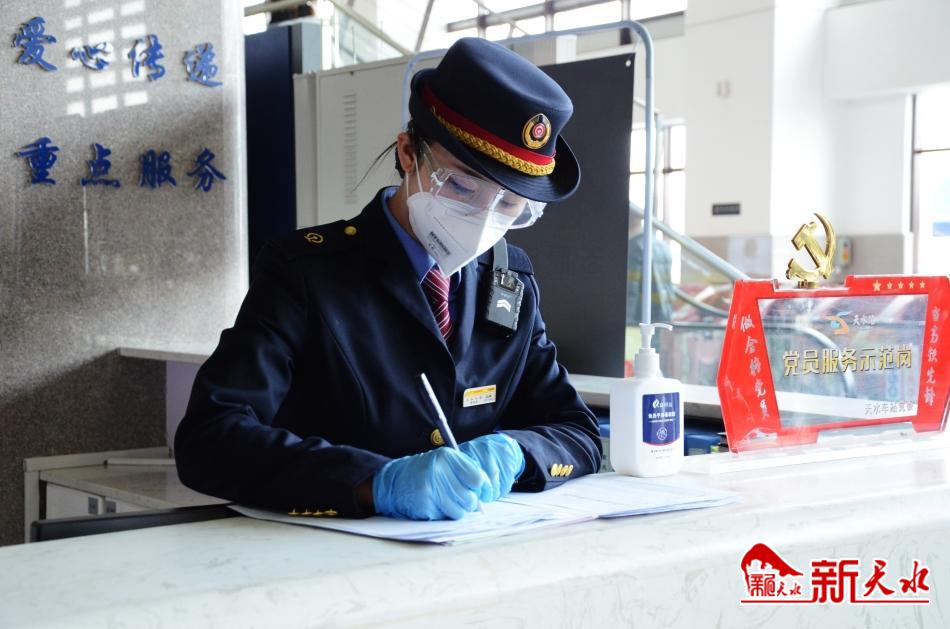 在天水南站服务台见到王璐时,她已经开启了日常忙碌模式。登记员工体温、登记负责区域通风消毒巡视台账、接待旅客问询服务……她时而在台前册子上认真填写,时而接打座机电话、回复对讲机消息,有旅客问询又及时上前耐心解答。尽管忙的焦头烂额,但她始终保持着平和的语气、温婉的微笑,清秀端庄的面容在一身藏蓝制服的映衬下,让人感觉莫名舒心。