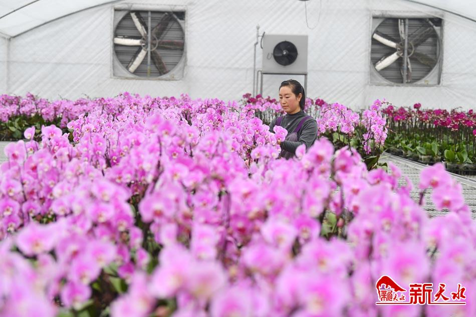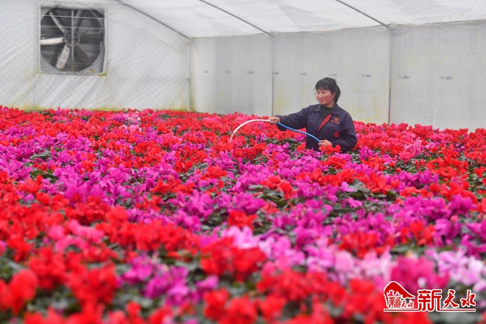 3月7日,清水县花卉园区,温室里的仙客来、蝴蝶兰纷纷绽放花朵,吸引众多游客前来观赏选购。近年来,清水县通过调整农业产业结构,推进现代农业发展,大力发展培育花卉产业,促进农民增收致富。2021年清水县花卉园区销量达2000多万盆,利润600多万元,带动465名农户就业,户均年增收2.8万元。