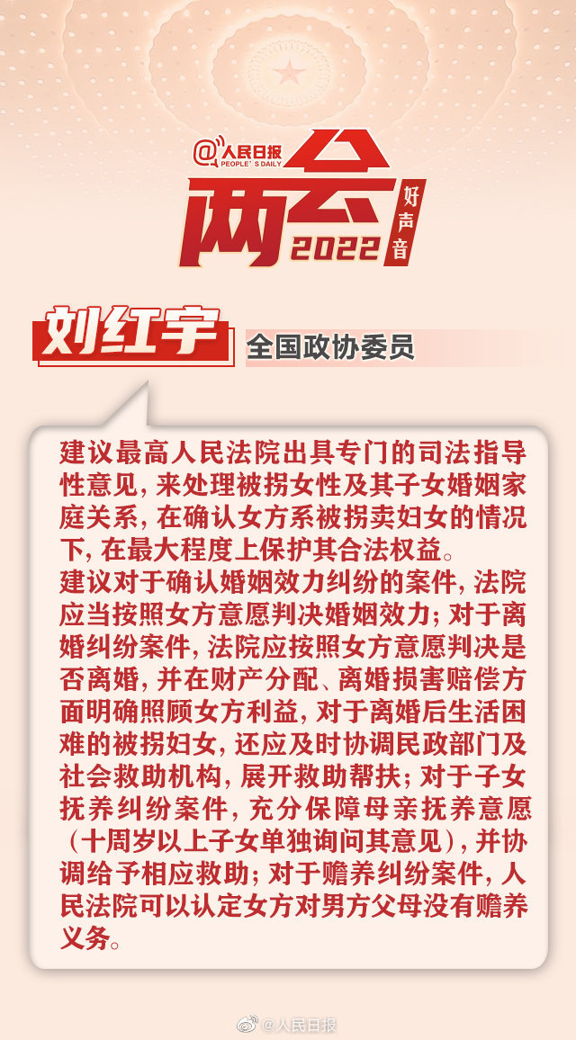 全国政协委员刘红宇认为,由于被拐妇女大部分本身文化水平不高,无法及时行使权利,被拐卖、被迫结婚的时间久远难以取证等多种原因,使得在一些案件中被拐女性不仅难以离婚,相关合法权益也都难以保障。并且相当一部分的被拐女性正是因为没有财产,无法负担抚养子女的费用,无法取得子女抚养权,回到原籍难以维持生活,才愿意留在收买她的家庭,甚至“谅解”收买她的“丈夫”。刘红宇建议最高人民法院出具专门的司法指导性意见,来处理被拐女性及其子女婚姻家庭关系,在确认女方系被拐卖妇女的情况下,在最大程度上保护其合法权益。