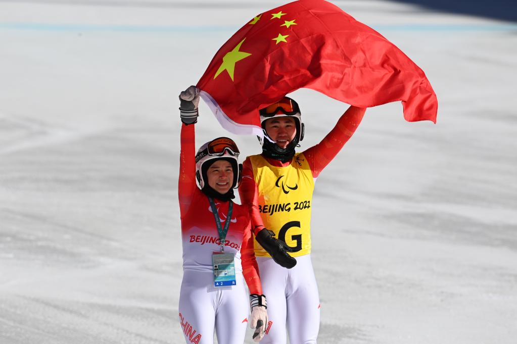 3月5日,中国选手朱大庆(左)和引导员闫寒寒赛后庆祝。新华社记者江汉摄