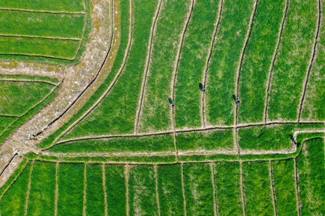 3月9日,浙江省宁波市鄞州区东吴镇天童村村民在田间管护农作物(无人机照片)。新华社发(胡学军 摄)