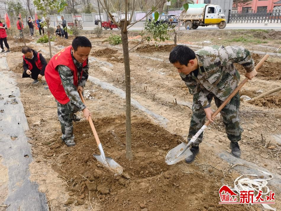植树现场,大家热情高涨、干劲十足,按照植树的每道工序,挥锹铲土、浇水植树、填土踩实,确保栽种一棵,成活一棵,忙碌的身影和刚种下的植株为太京的春天增添了一片生机。