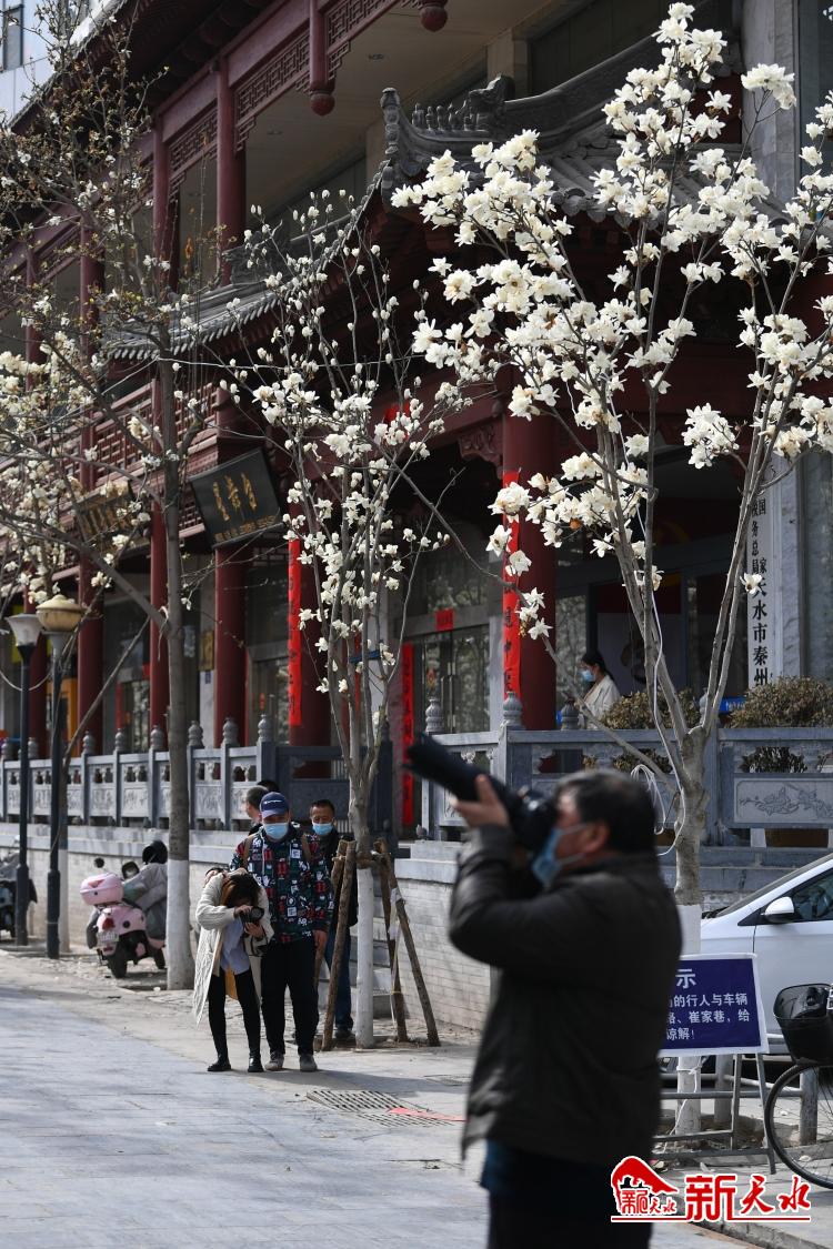 3月17日,市民在秦州区自由路玉兰花下游玩。
