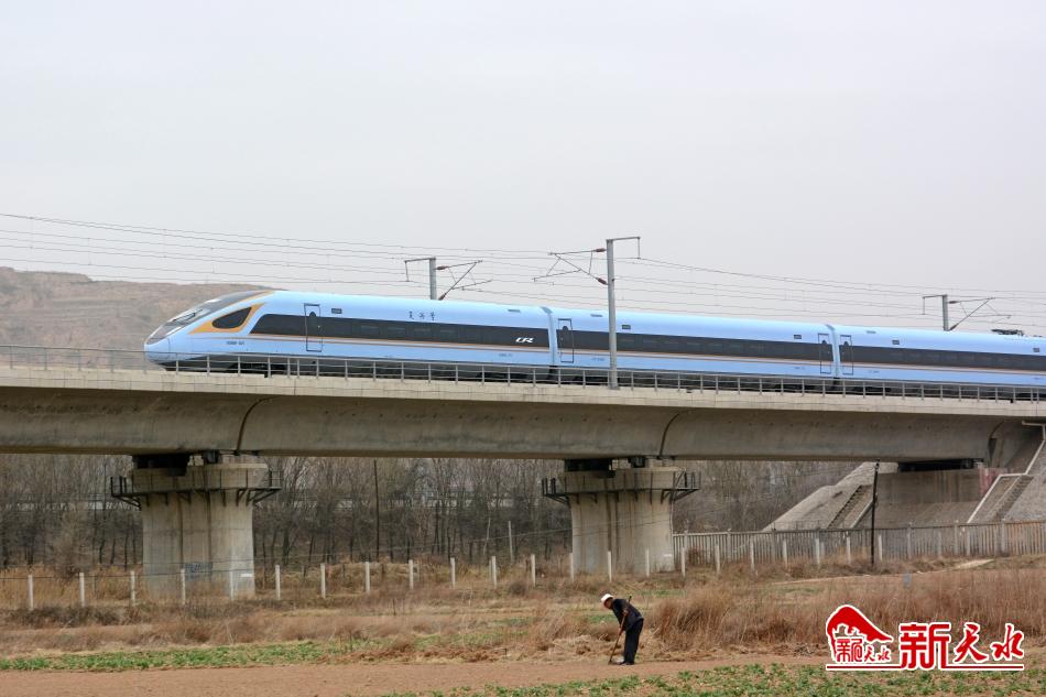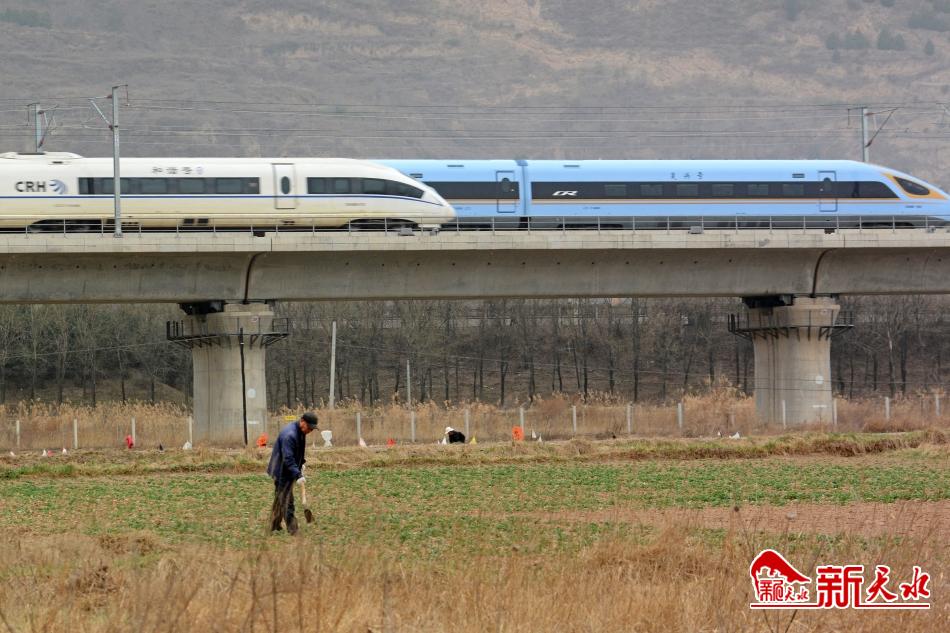 3月15日,复兴号与和谐号高速列车从麦积区渭南镇毛家村驶过。天水市自2017年通行高速铁路以来,缩短了天水与西安、兰州等周边城市的通达时间,方便市民出行,推动了经济社会高质量发展。