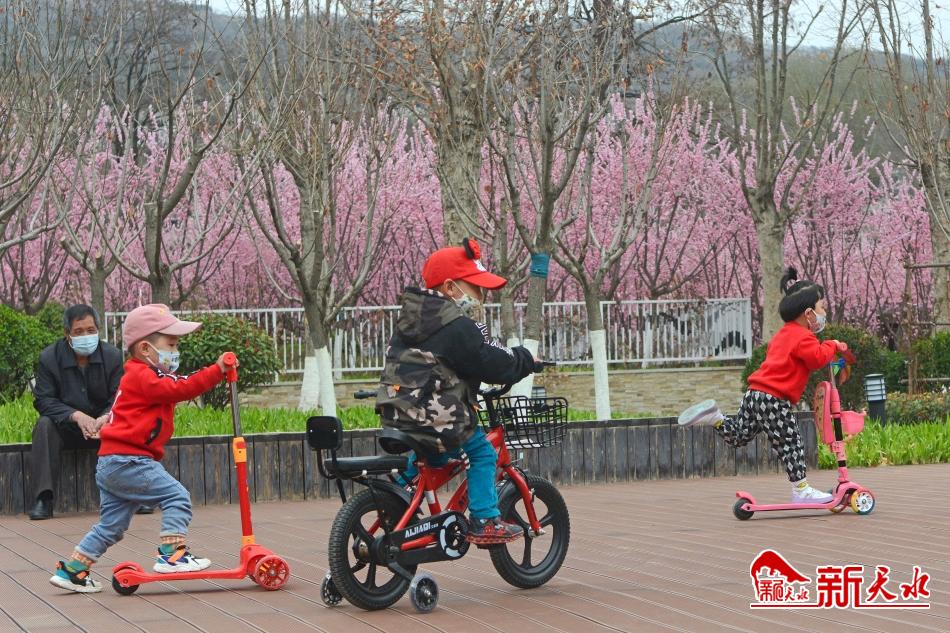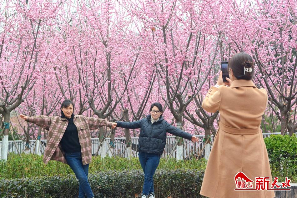 3月17日,秦州区弘文园内樱花、梅花绚烂绽放,市民徜徉花林中,休闲拍照、游园踏春。