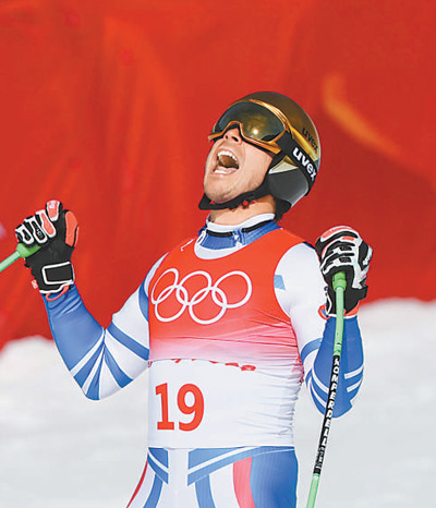 2月7日,北京2022年冬奥会高山滑雪男子滑降项目比赛在延庆国家高山滑雪中心举行。图为获得亚军的法国选手约翰·克拉雷在赛后庆祝。