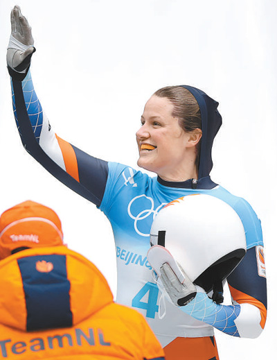 2月12日,北京2022年冬奥会女子钢架雪车比赛在国家雪车雪橇中心举行。图为获得季军的荷兰选手金伯莉·博斯在赛后致意。