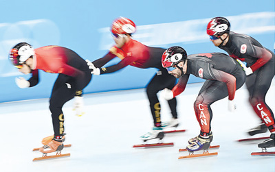 2月11日,北京2022年冬奥会短道速滑项目男子5000米接力半决赛在首都体育馆举行。图为加拿大队队员查尔斯·哈梅林(右二)在比赛中。