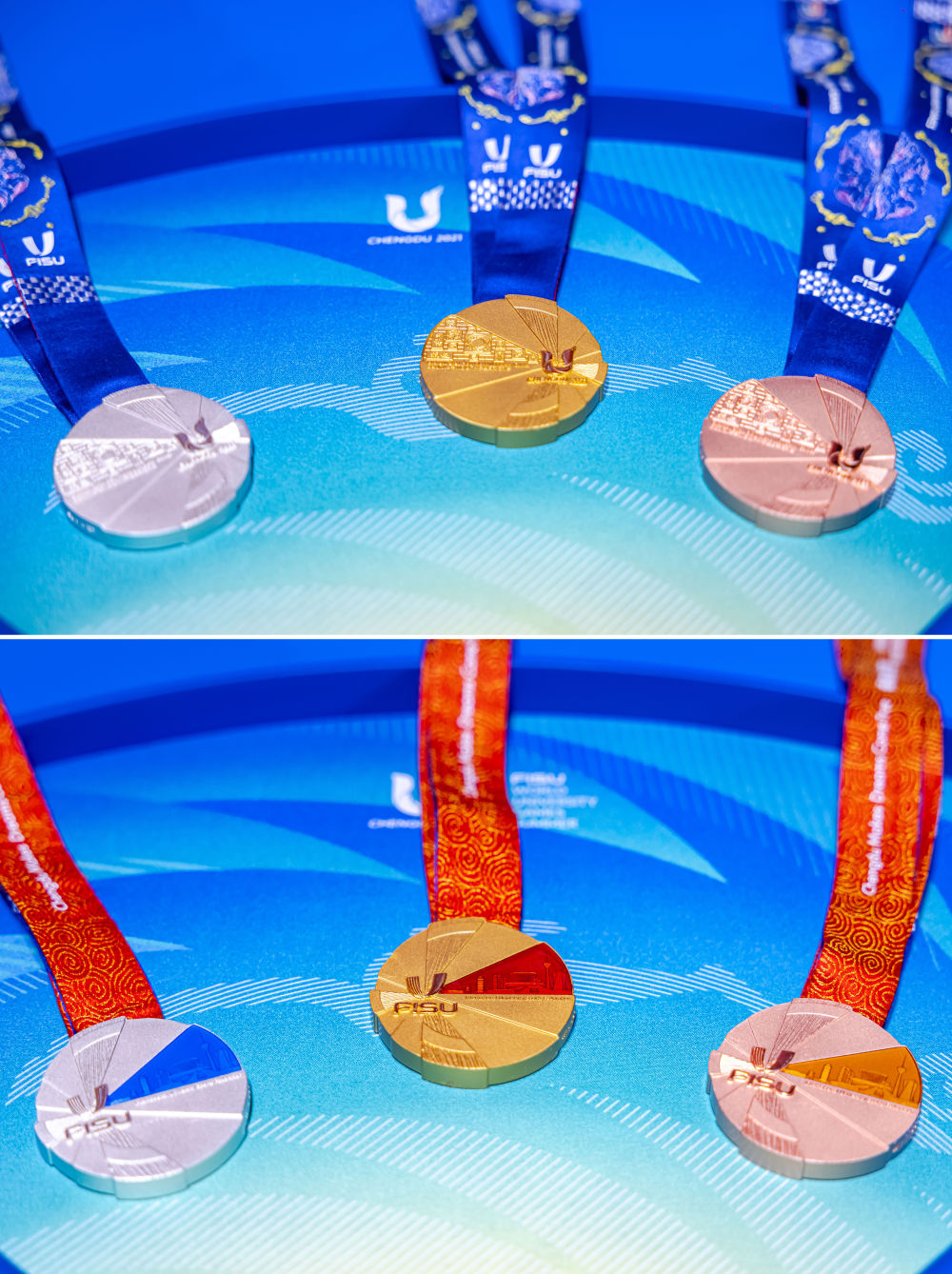 上图为成都大运会奖牌“蓉光”正面,下图为奖牌“蓉光”背面。新华社发