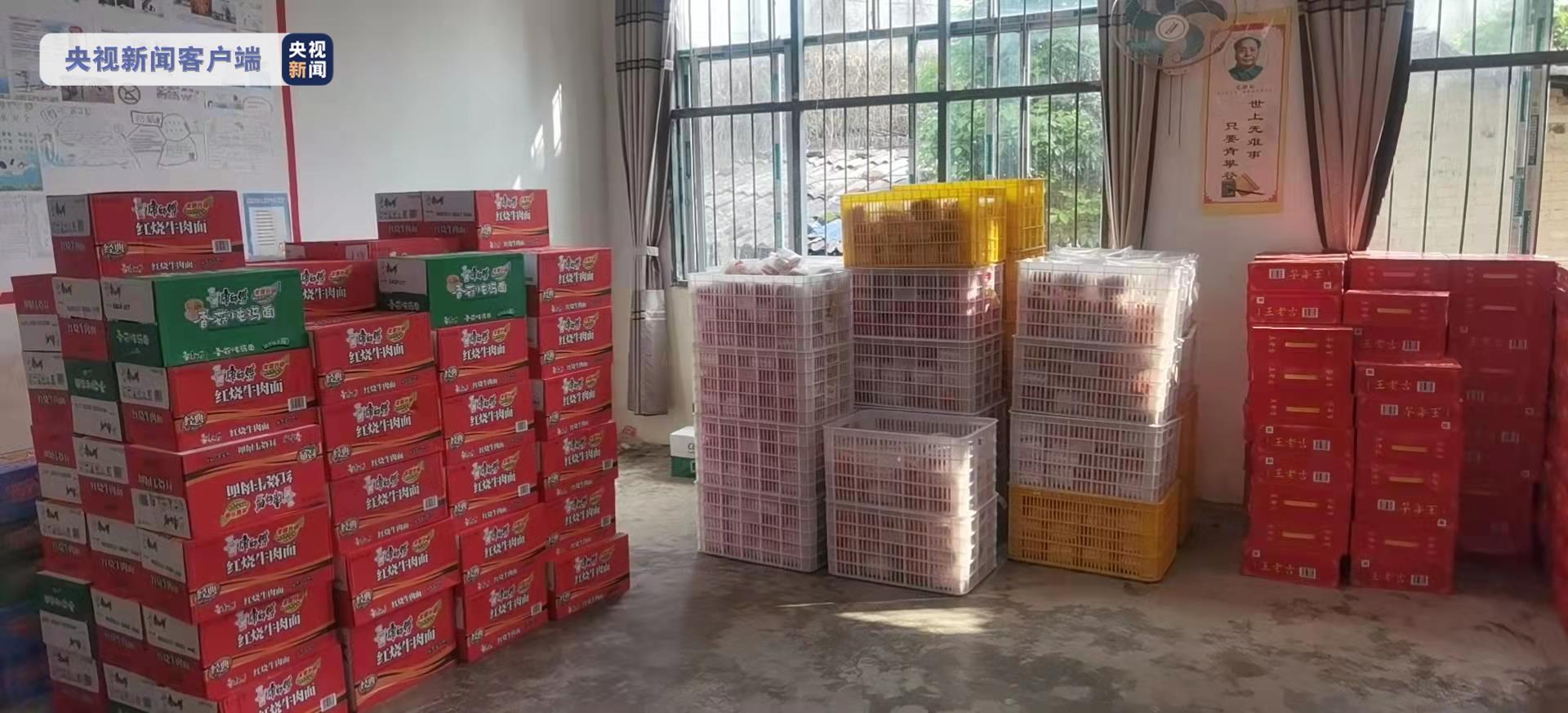 救援物资运达救援现场,含面包200斤、雨鞋200双、手电280只、铁铲100把、八宝粥90箱、矿泉水120箱、帐篷133顶、冲锋衣200件、折叠桌椅50套、雨衣550套、照明灯4台、充电宝550个、防护口罩2万只、通用手套500双、移动照明10套、消毒粉50千克、消毒液100瓶、消毒酒精200瓶、牛奶70箱。