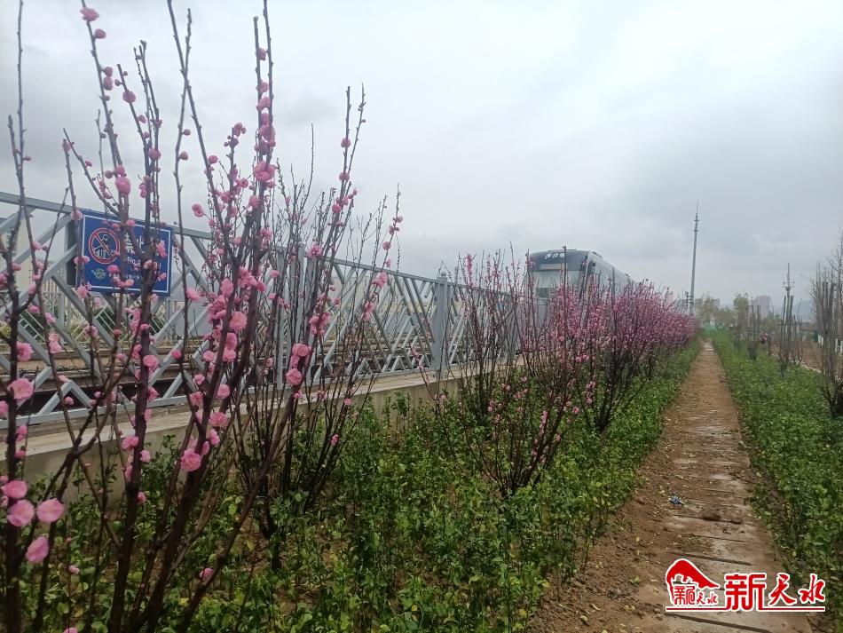 3月21日上午,在秦州区成纪大道恒顺锦润悦府路段,工人正在路边护堤上栽植大叶黄杨。此时天空正下着小雨,在成纪大道碧桂园、恒顺锦润悦府等路段,工人戴着帽子和口罩埋头干活,抓住有利时机抢栽黄杨、石楠、女贞、榆叶梅等苗木。其中 一名工人指着天水有轨电车护栏外的一排树对记者说,那是前几日他们刚栽植的榆叶梅,现在枝头上的梅花有的含苞欲放,有的已经迎春绽放,十分好看。