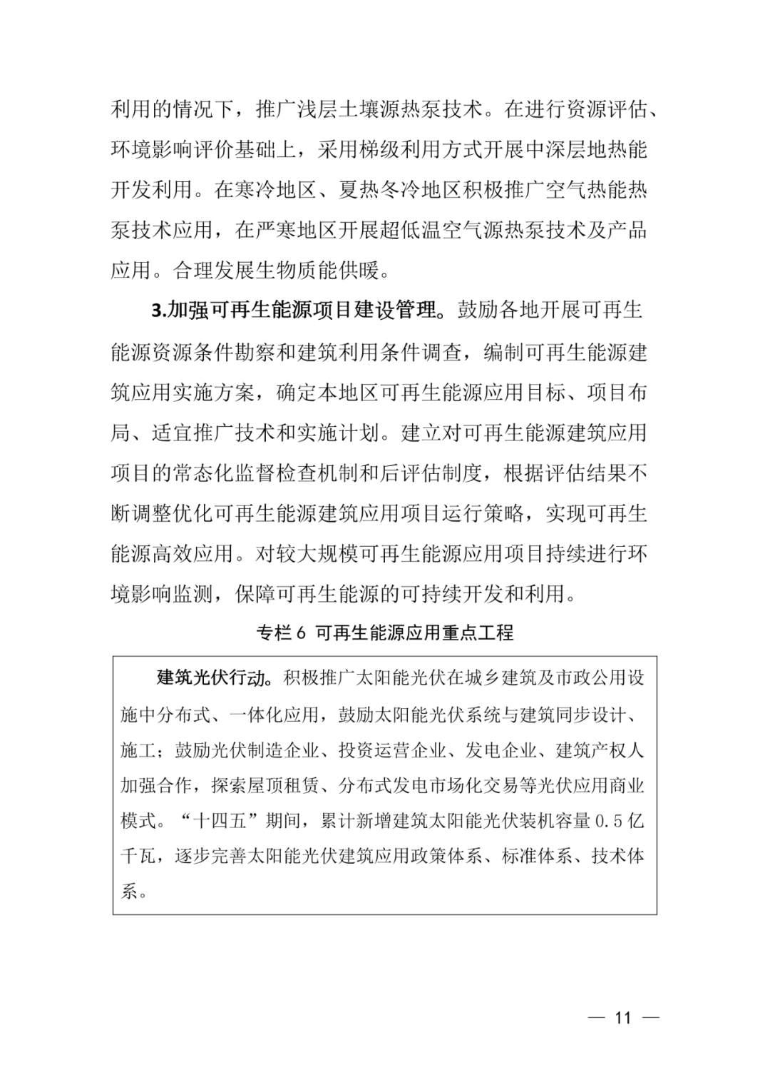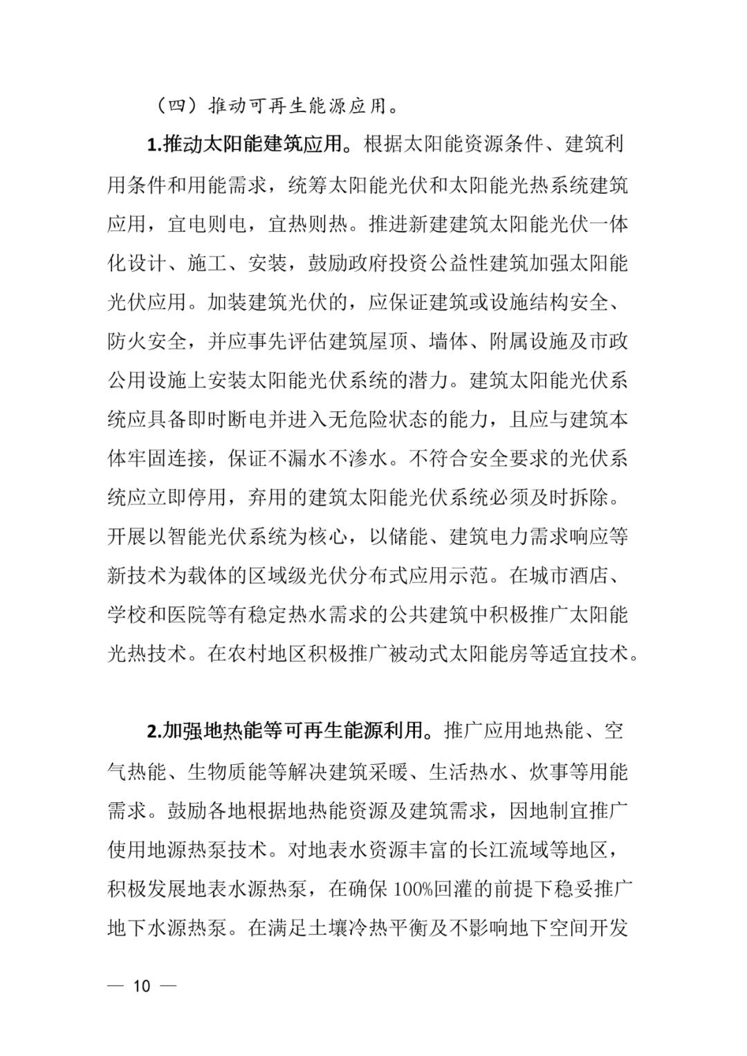 四、推动可再生能源应用。推动太阳能建筑应用。推进新建建筑太阳能光伏一体化设计、施工、安装,鼓励政府投资公益性建筑加强太阳能光伏应用。加强地热能等可再生能源利用。推广应用地热能、空气热能、生物质能等解决建筑采暖、生活热水、炊事等用能需求。加强可再生能源项目建设管理。