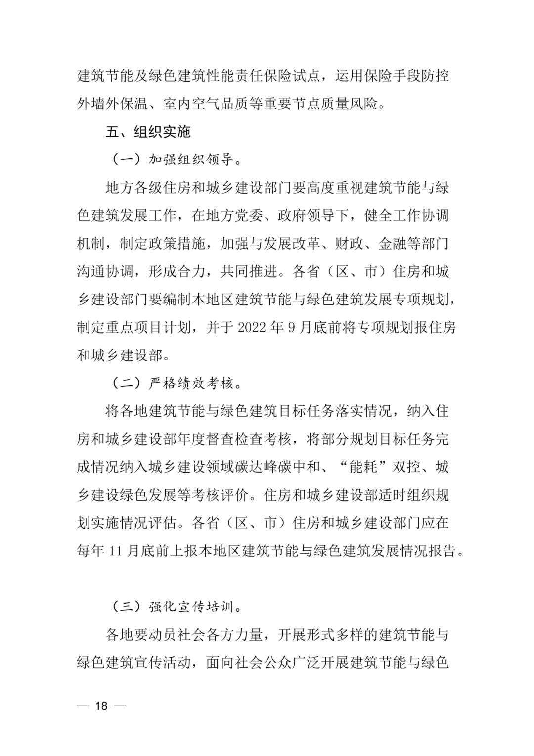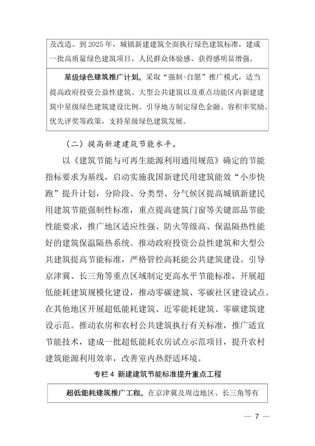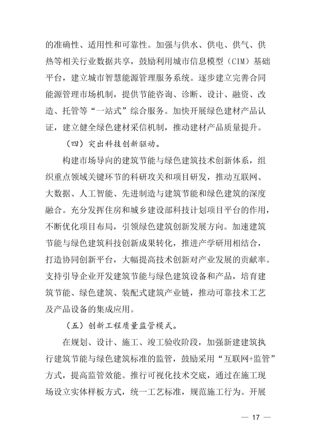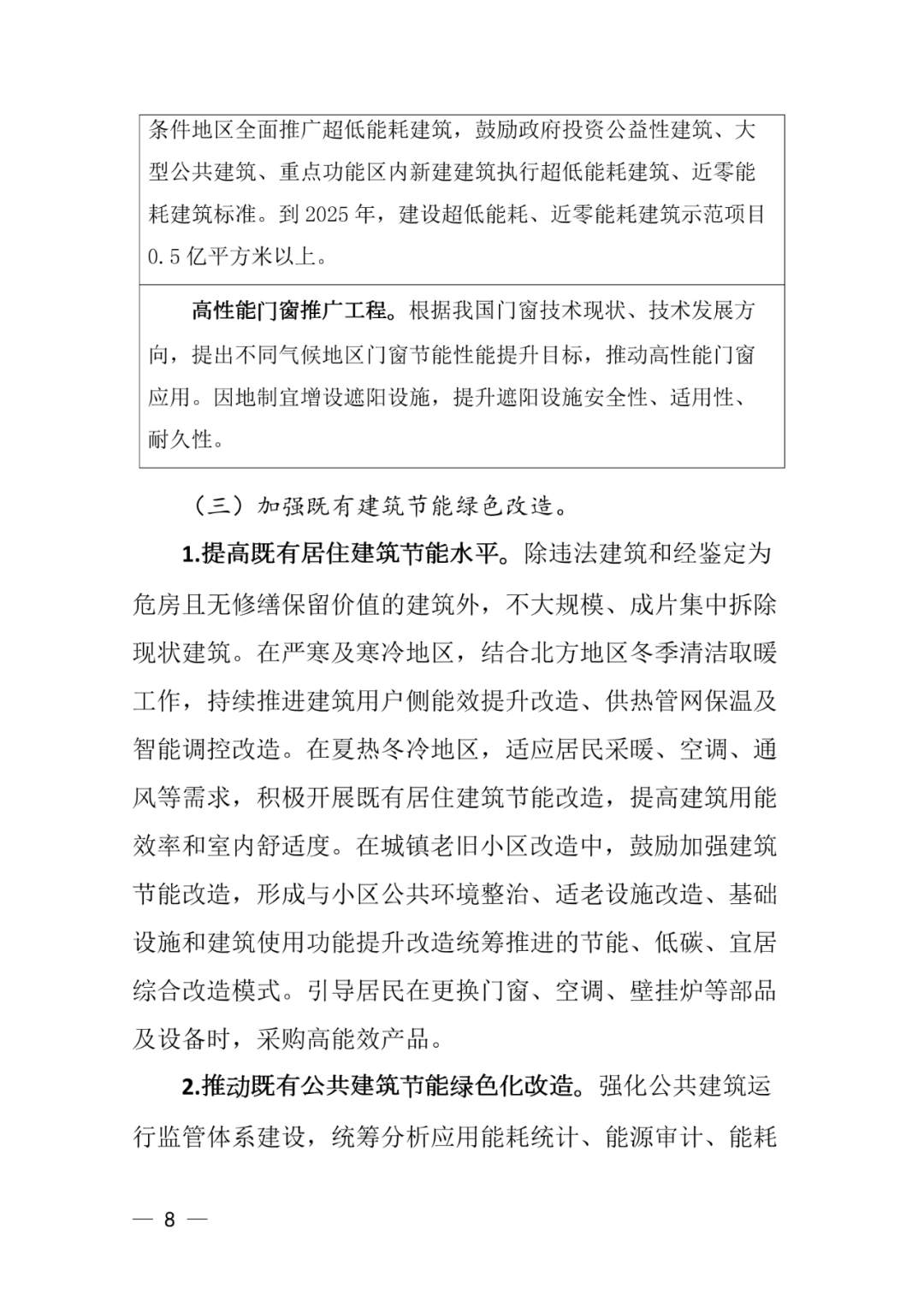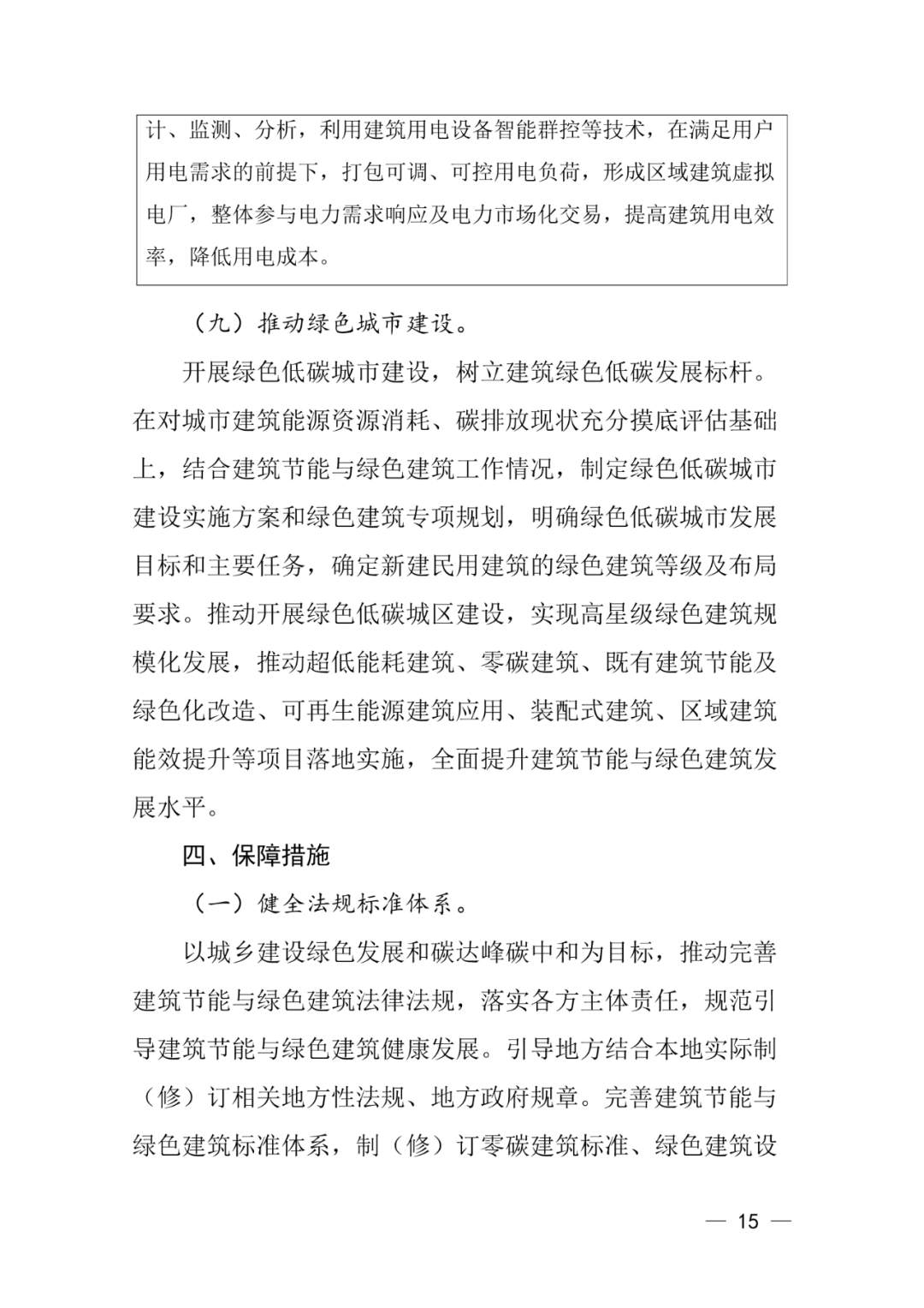九、推动绿色城市建设。开展绿色低碳城市建设,树立建筑绿色低碳发展标杆。推动开展绿色低碳城区建设,实现高星级绿色建筑规模化发展,推动超低能耗建筑、零碳建筑、既有建筑节能及绿色化改造、可再生能源建筑应用、装配式建筑、区域建筑能效提升等项目落地实施,全面提升建筑节能与绿色建筑发展水平。