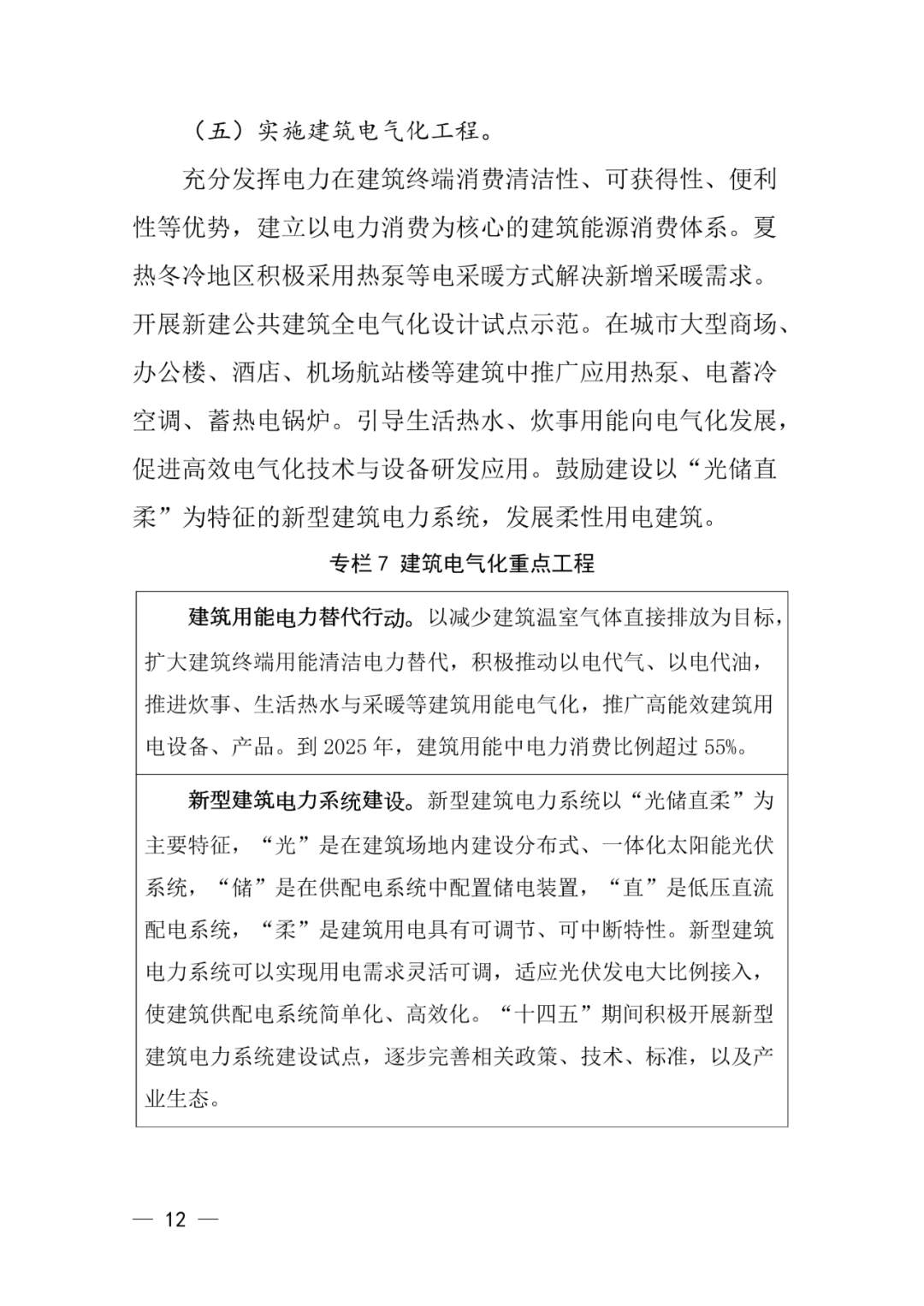 五、实施建筑电气化工程。开展新建公共建筑全电气化设计试点示范。在城市大型商场、办公楼、酒店、机场航站楼等建筑中推广应用热泵、电蓄冷空调、蓄热电锅炉。