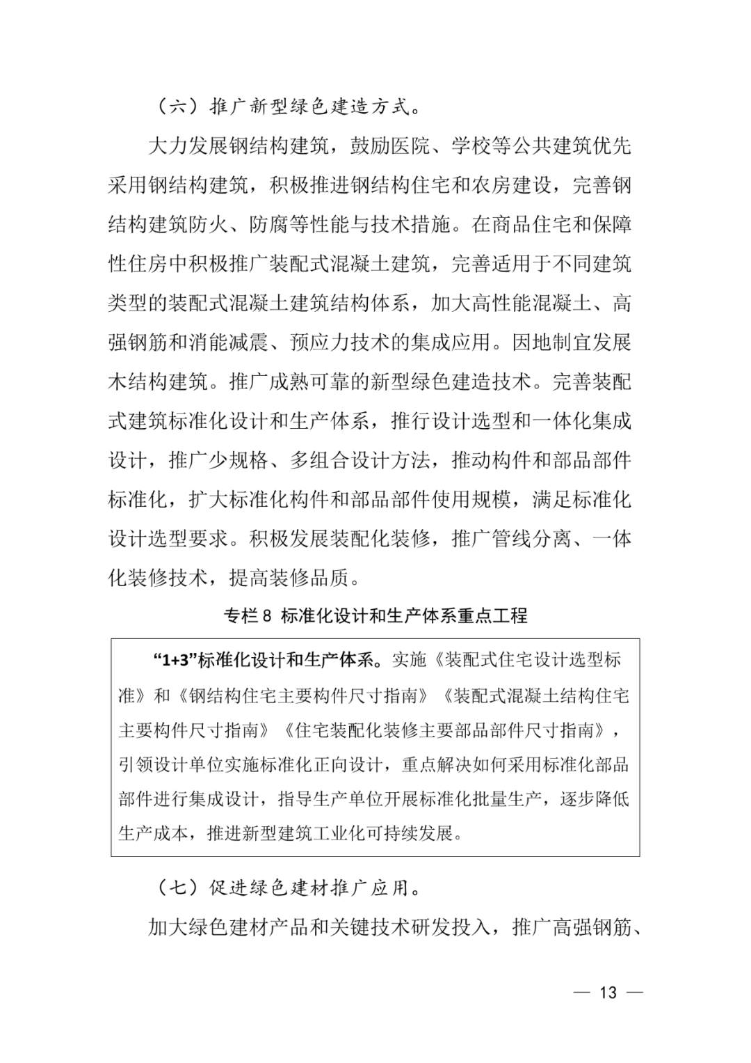 六、推广新型绿色建造方式。大力发展钢结构建筑,鼓励医院、学校等公共建筑优先采用钢结构建筑,积极推进钢结构住宅和农房建设,完善钢结构建筑防火、防腐等性能与技术措施。