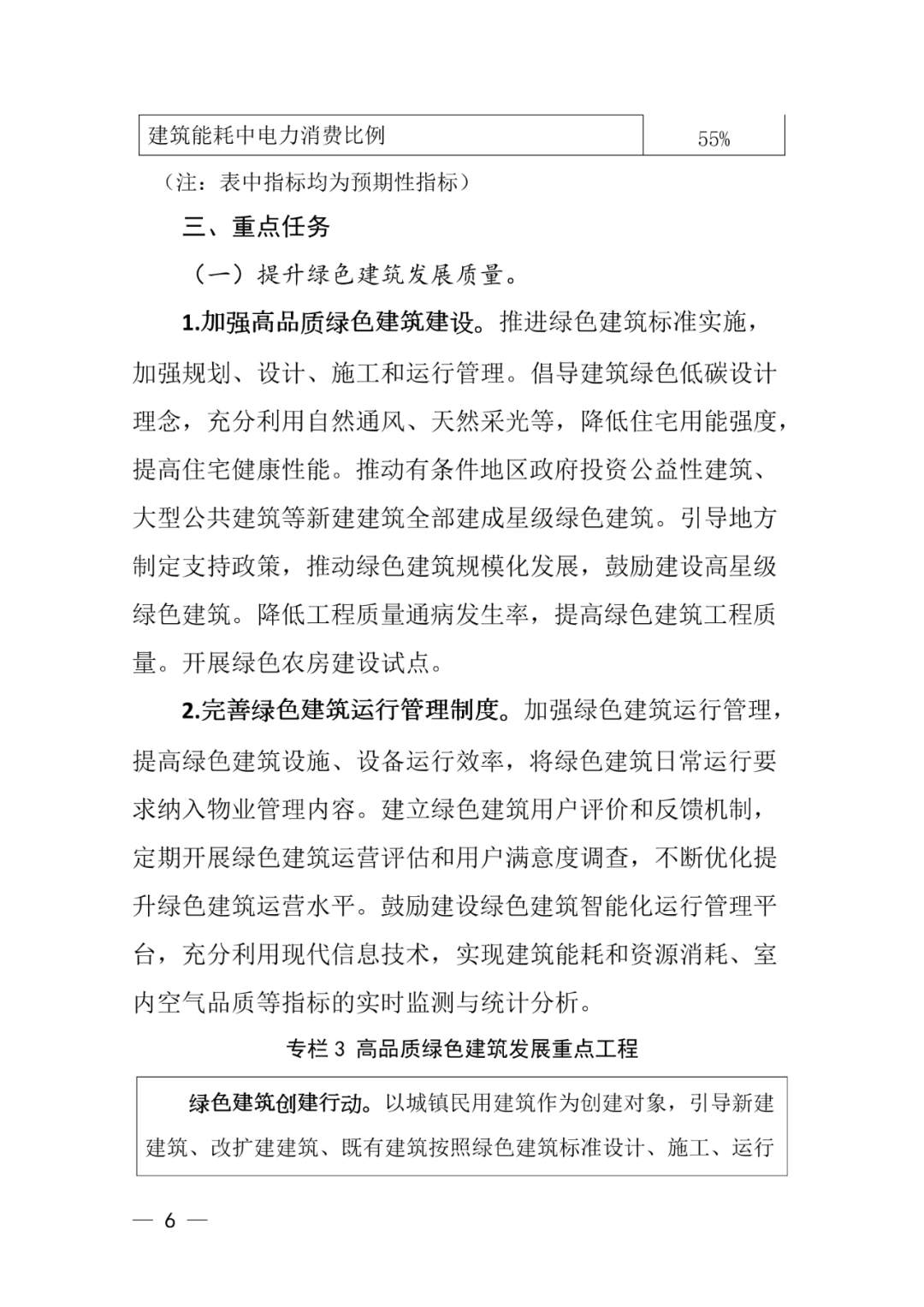一、提升绿色建筑发展质量。加强高品质绿色建筑建设。推进绿色建筑标准实施,加强规划、设计、施工和运行管理。完善绿色建筑运行管理制度。加强绿色建筑运行管理,提高绿色建筑设施、设备运行效率,将绿色建筑日常运行要求纳入物业管理内容。